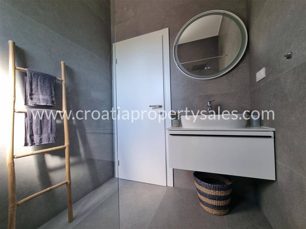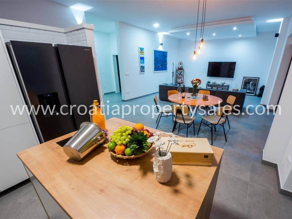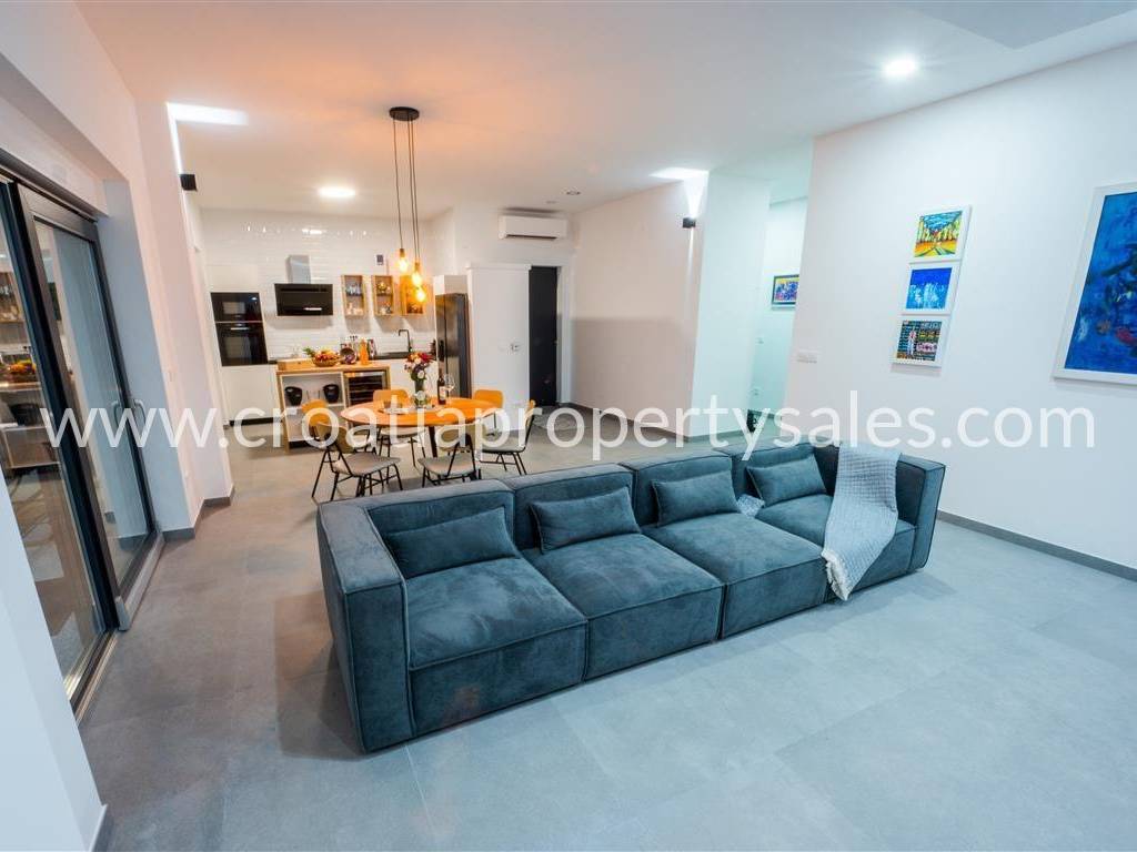 Kuća je potpuno luksuzno opremljena, centralnim klima uređajem , troslojnim staklom na otvorima, električnim podizačima roleta, komaricama a s obzirom da su podovi prekriveni keramikom ugrađeno je podno grijanje na vodu poznate marke Daikin Altherma.