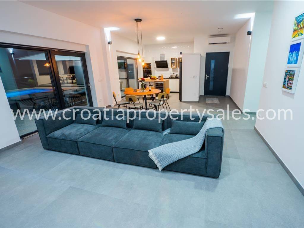Ova lijepa prizemnica sastoji se od predsoblja s garderobom, 3 spavaće sobe, dvije kupaonice, kuhinje, dnevne sobe i blagovaonice otvorenog koncepta iz kojih se uzlazi na terasu s grijanim bazenom dimenzija 10x3,5m.