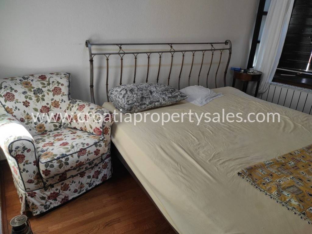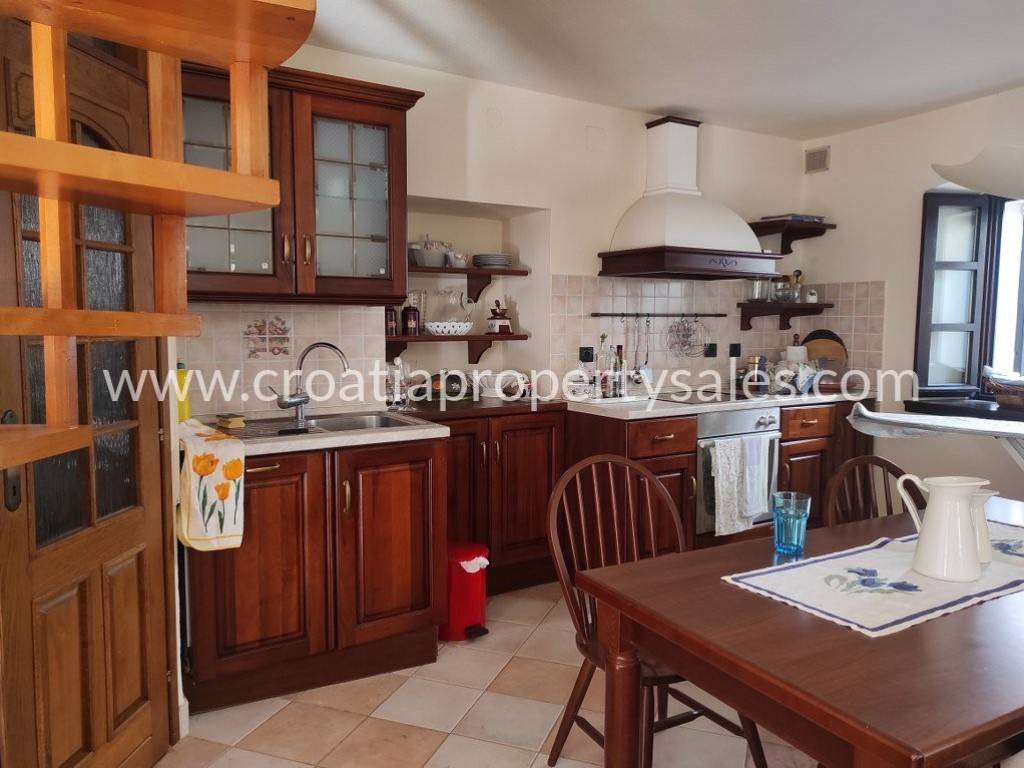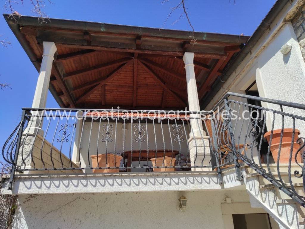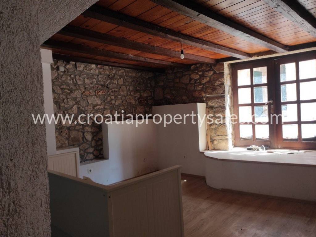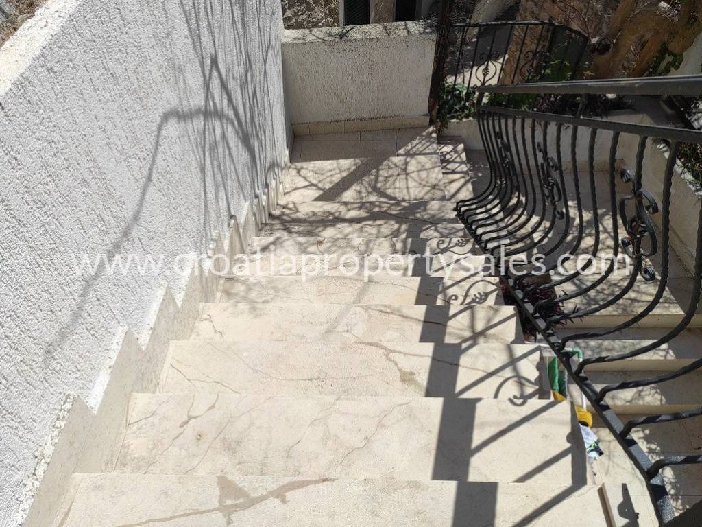 Na gornjoj etaži se nalazi kuhinja s blagovaonicom, dnevni boravak, wc i prostorija za sušilicu i perilicu rublja. Unutarnjim ili vanjskim stepenicama dolazi se u potkrovlje gdje se nalaze tri spavaće sobe s kupaonicom te prekrasna natkrivena terasa okrenuta prema jugu.