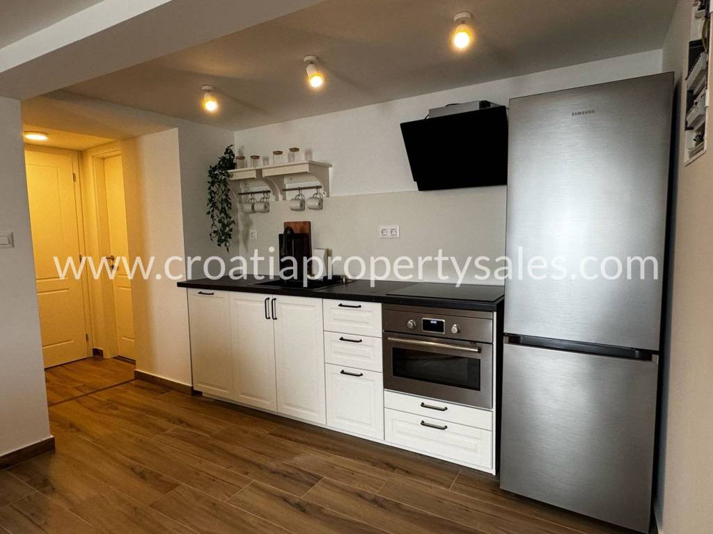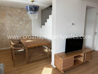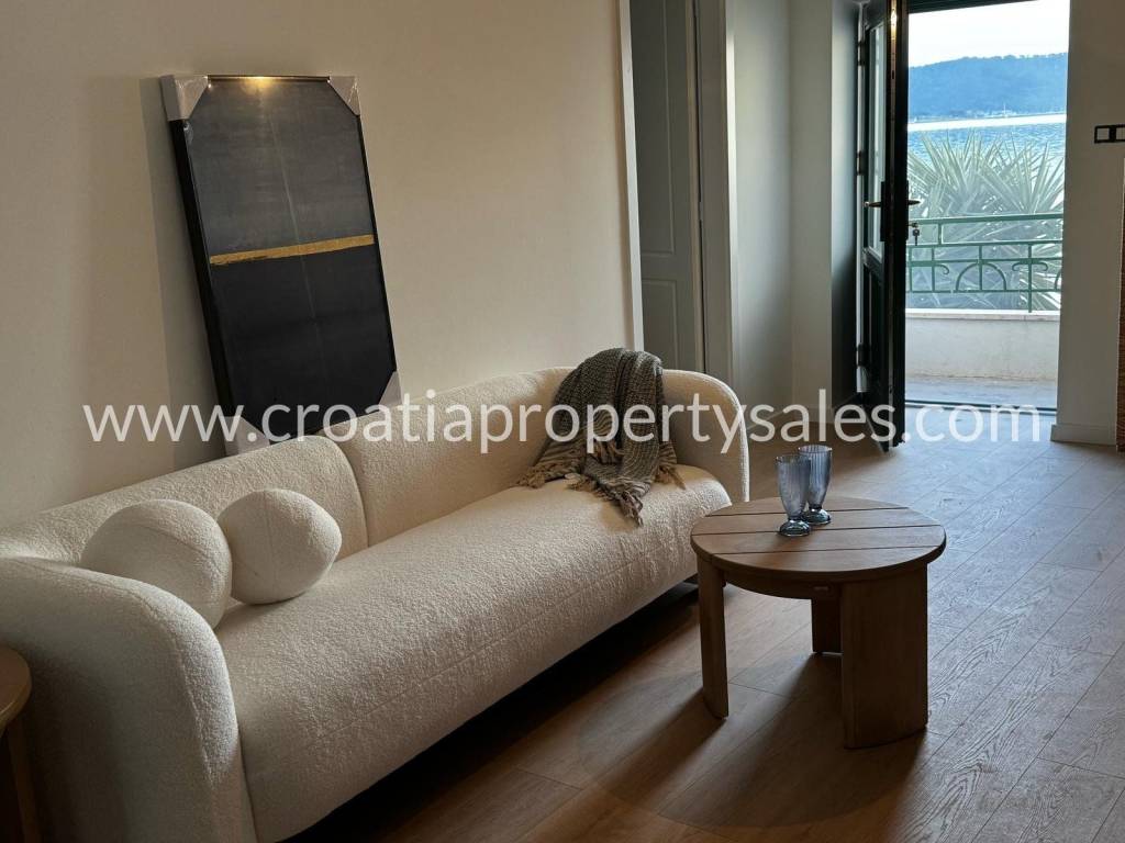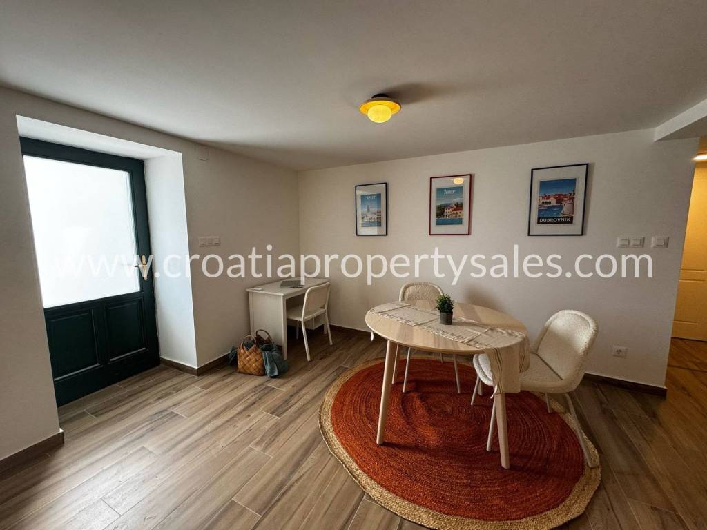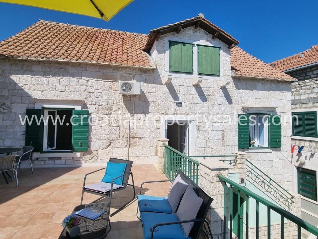 Predivna kamena kuća u prvom redu do mora. Ukupna stambena površina iznosi 215 m2. Nekretnina sadržaja 3 apartmana koja imaju zaseban ulaz. Prizemlje sadržava apartman i studio apartman zasebne kvadrature od 43 m2, te četverosobni stan na dvije etaže od 130 m2 + terasa. Terasa pruža jedinstven pogled na cijelu obalu, te prostora za opuštanje i druženje. Kuća se nalazi u centru mjesta, te su svi potrebni sadržaji za život na pješačkoj udaljenosti. Nekretnina je u procesu kompletne renovacije i u tijeku renovacije mislilo se i na najmanje detalje. Po završetku radova nekretnina će biti kompletno namještena, te će se takva i prodavati. Udaljenost o najbliže zračne luke je 11 km.