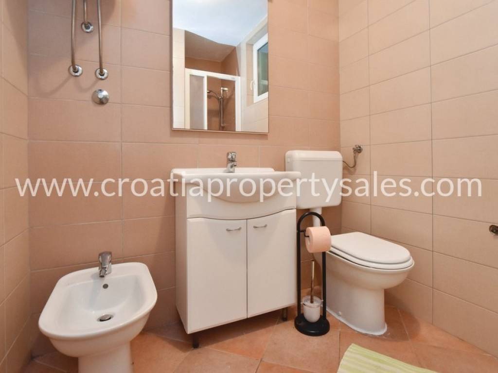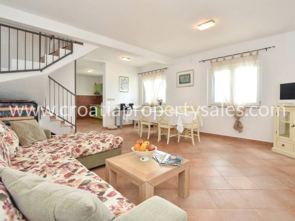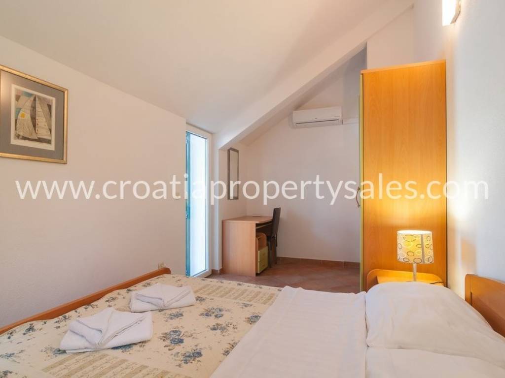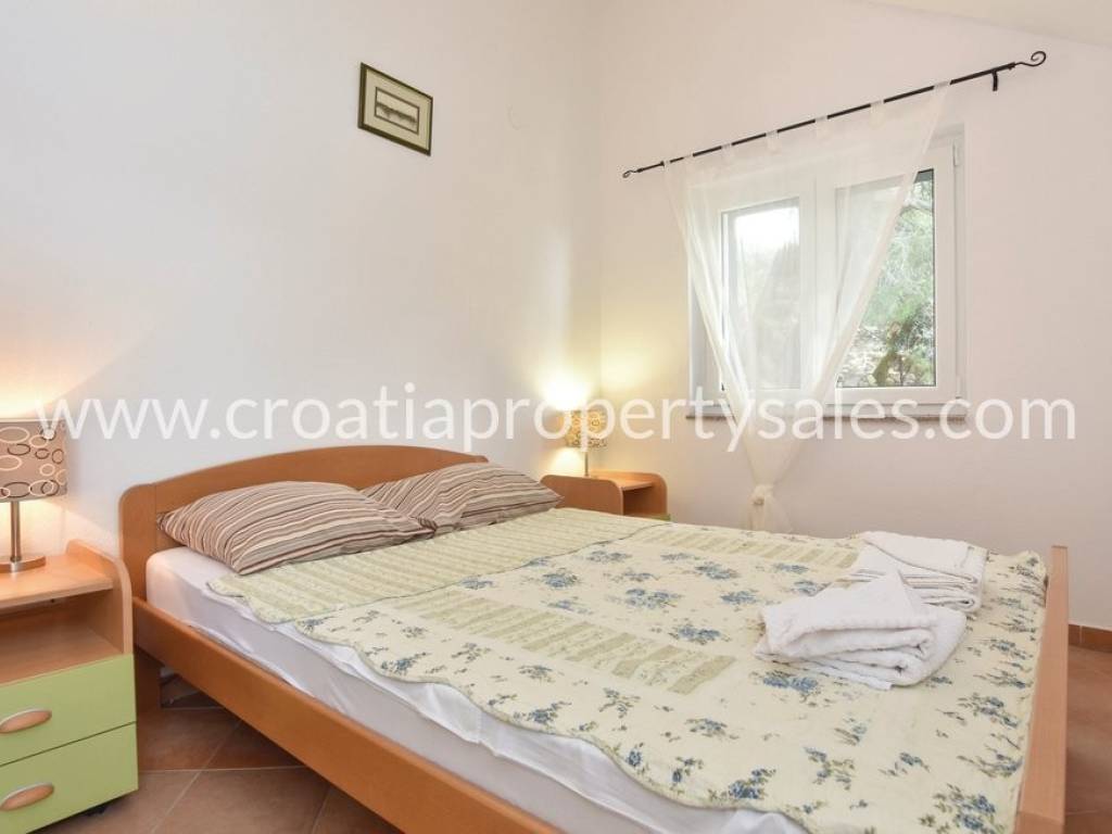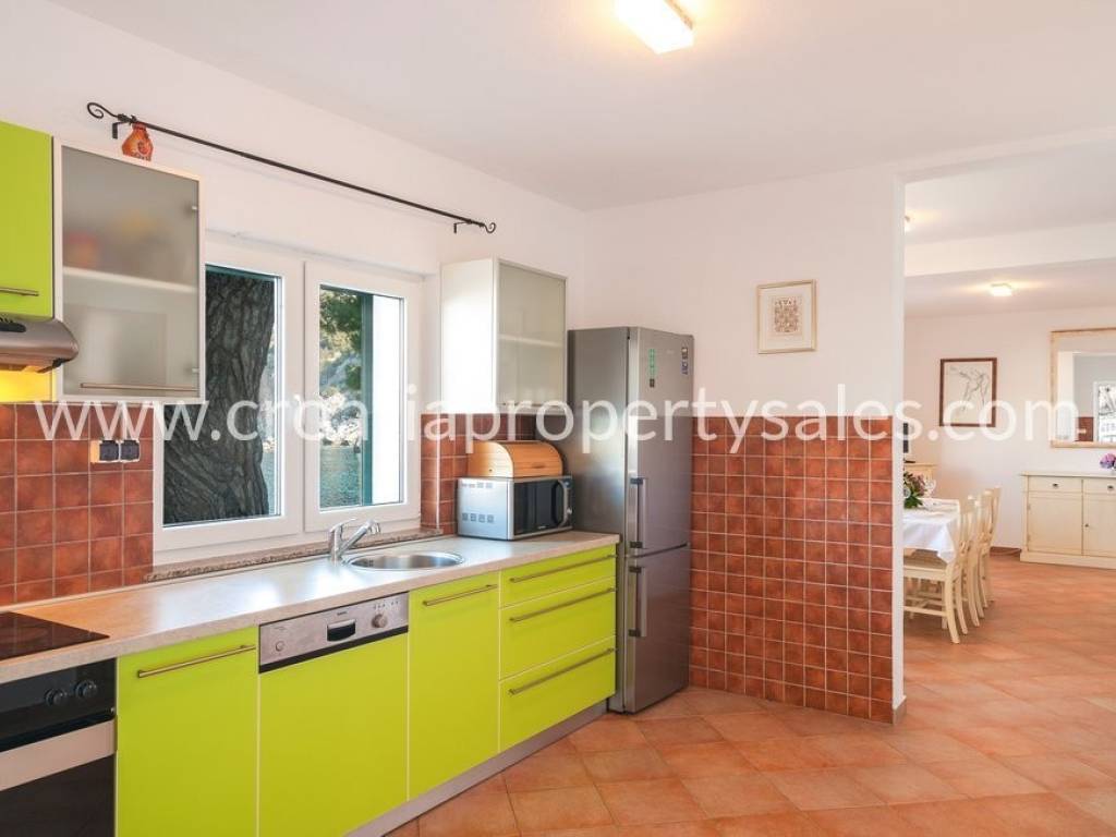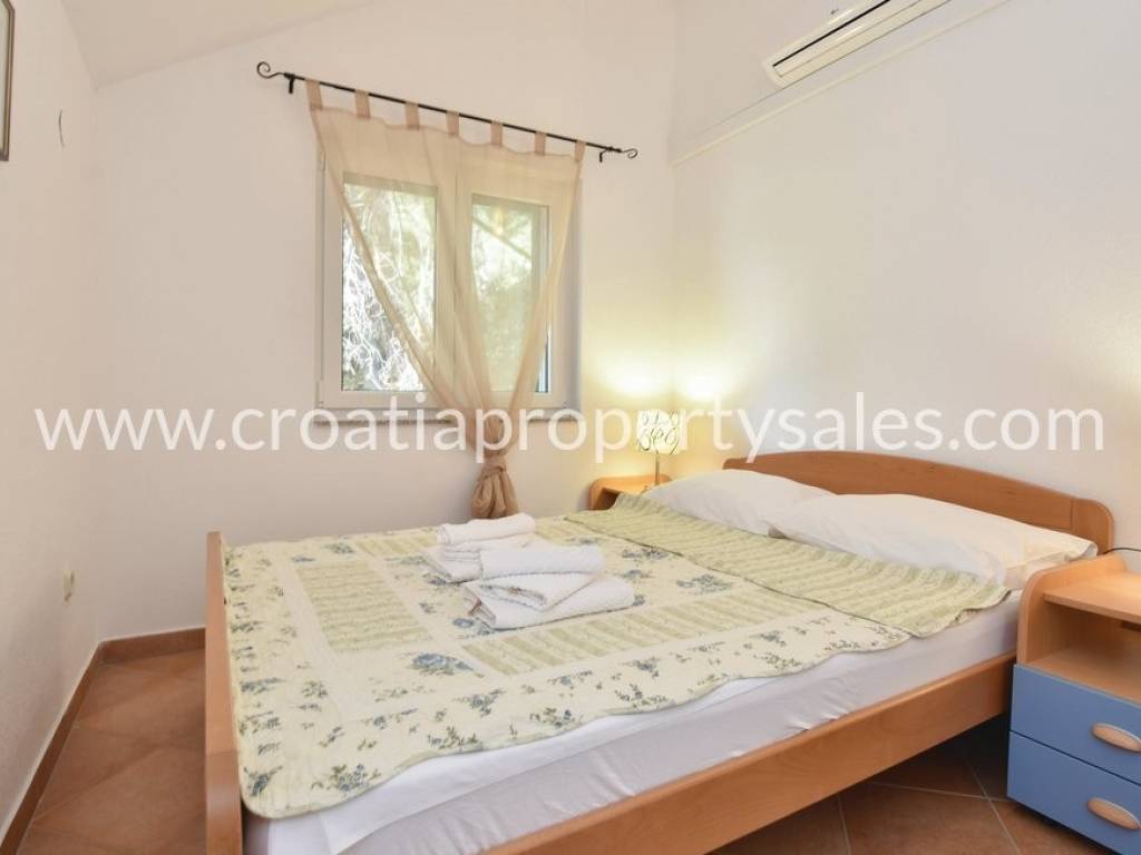 Samostojeća kuća na dvije etaže na vrlo atraktivnoj lokaciji. Kuća se nalazi u blizini šljunčane plaže, u prvom redu do mora. U prizemlju se nalazi kuhinja, blagovaonica, dnevni boravak i kupaonica. Ova etaža ima izlaz na prostranu terasu oko koje se nalaze visoka stabla borova koja osiguravaju ugodnu hladovinu za ljetnih mjeseci. Na gornji kat vode unutrašnje stepenice gdje se nalaze 4 spavaće sobe, toalet, te izlaz na balkon s kojeg se pruža jedinstven pogled na okolnu prirodu i more. Mogućnost najma parking mjesta u blizini kuće. Ova nekretnina posjeduje vez za brod.