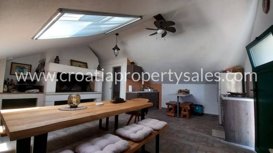 Poviše garaže nalazi se blagovaonica s kuhinjom, velikim kaminom i WC-om. Prigodna za društvena okupljanja.