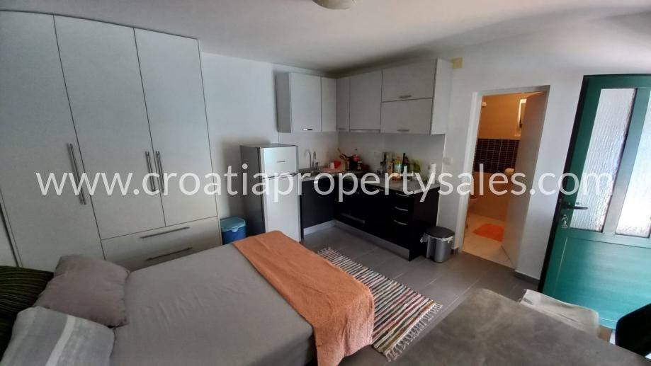 Donji studio apartman s kupaonicom broji 20 m2. Klimatiziran. Uz njega nalazi se bunar koji se može koristiti za zalijevanje vrta ili kako bi se proširio studio apartman. 2 pomoćne prostorije (spreme) nalaze se uz objekt. Ispred je vanjski kamin.
