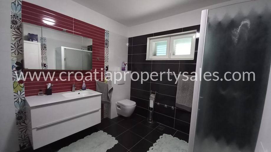 - 115 m2 unutarnje površine - 43 m2 terase (od toga 25 m2 natkriveno konkretnim krovom) - 3 sobe (10, 12 i 14 m2) - 2 kupaonice s WC-om (12 i 9 m2) - strojarnica (centralno grijanje Buderus najviše kvalitete na drva, centralno grijanje na struju, akumulacija 800L vode, bojler grijan solarnim panelom)