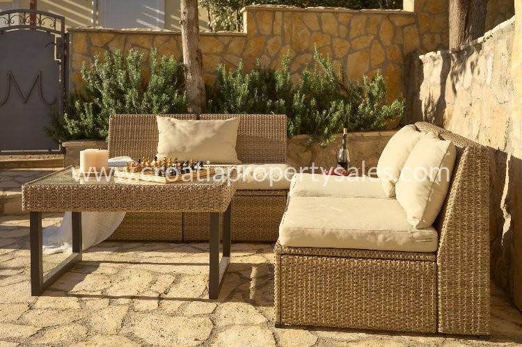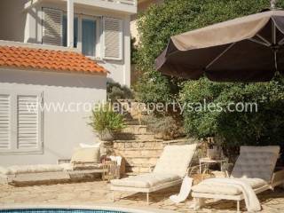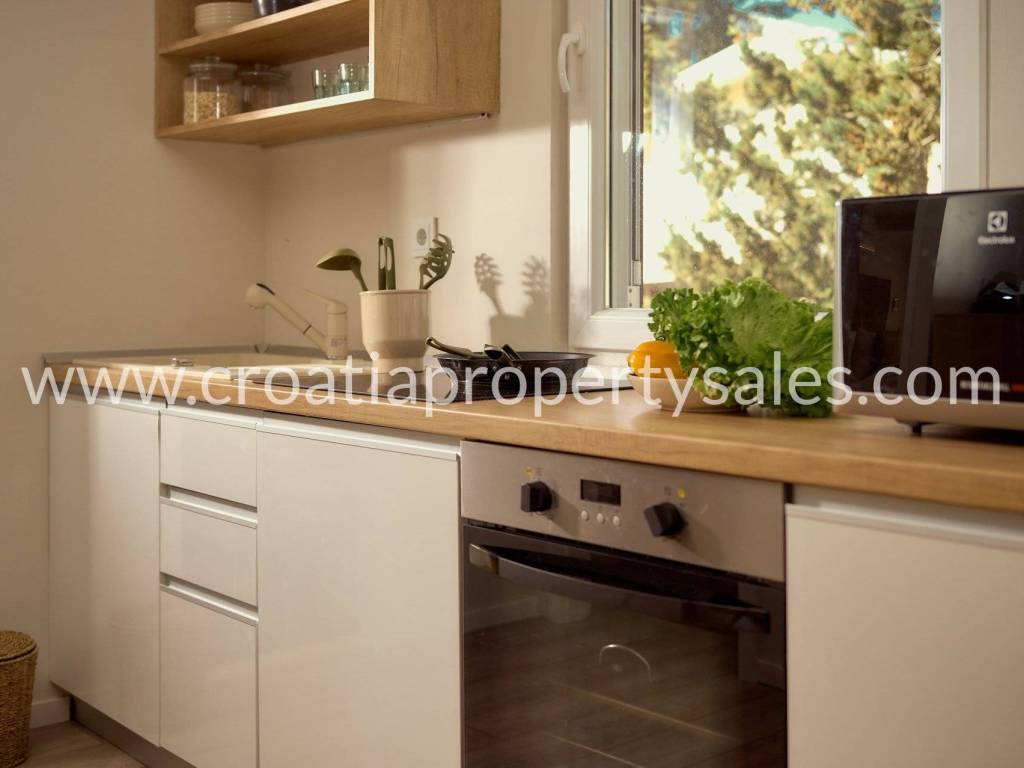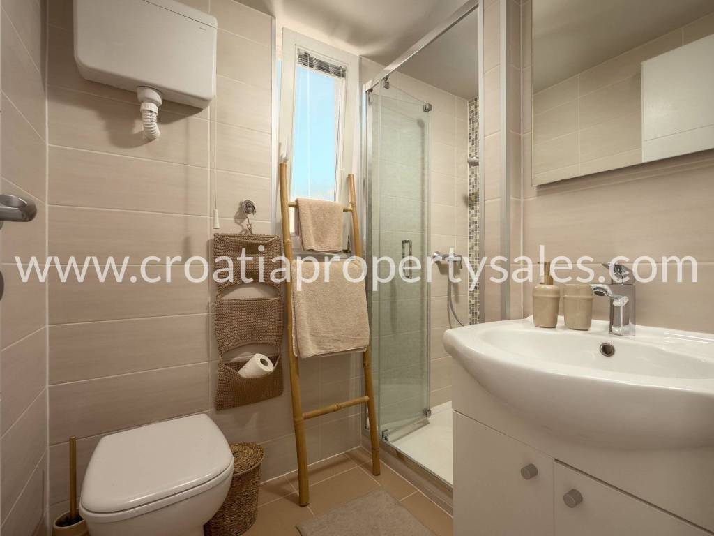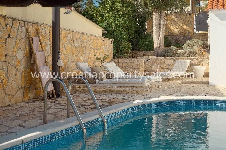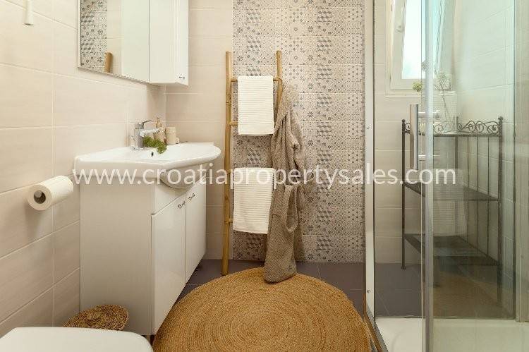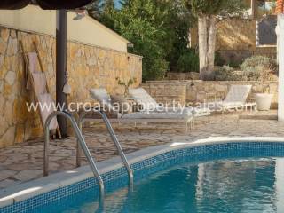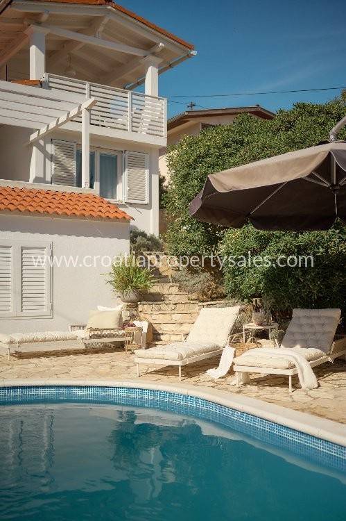Samostojeća kuća apartmanskog tipa s bazenom. Renovirana je 2024., te uređena s mnogo stila. Smještena je na atraktivnoj lokaciji 50 m od mora i blizu prekrasnih plaža. Ukupna površinakuće je 150m2 i ima tri etaže. U prizemlju se nalazi velika sprema i praonica rublja. Na prvoj etaži nalaze se dva jednosobna apartmana s terasom. Na drugoj etaži nalazi se jednosoban apartman i terasa. Obje terase imaju prekrasan pogled na more i zasigurno će biti omiljeno mjesto za sjedenje budućim vlasnicima. Dvorište s bazenom također je ugodno mjesto za boravak, okruženo je visokim zidom te osigurava privatnost. Ova nekretnina ima 2 parkirna mjesta.