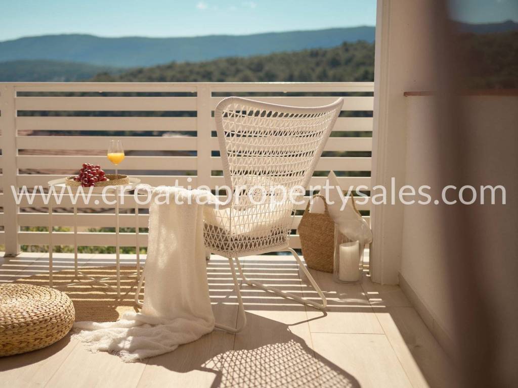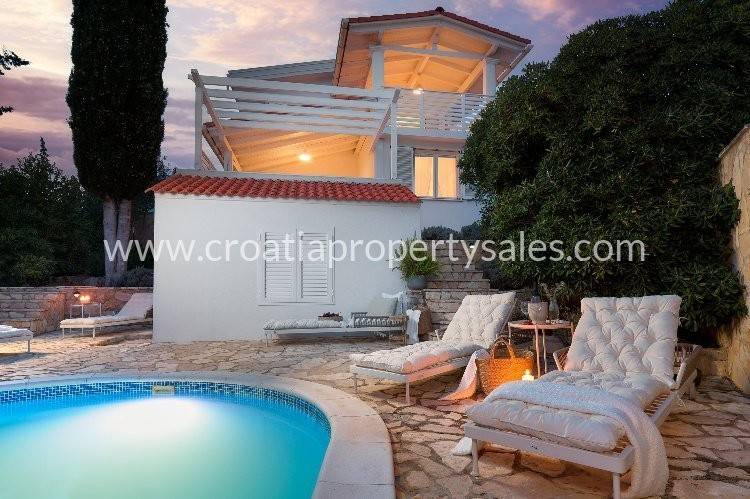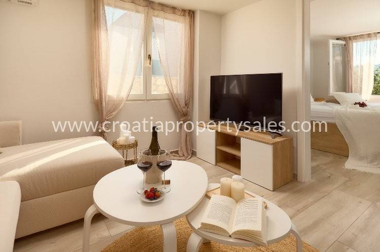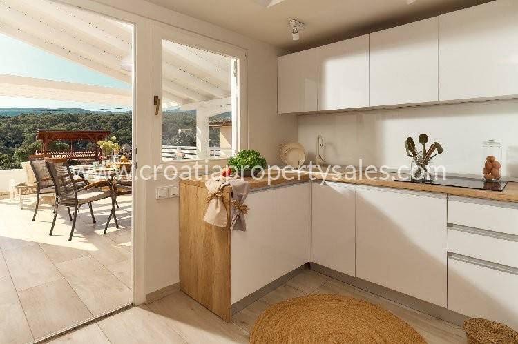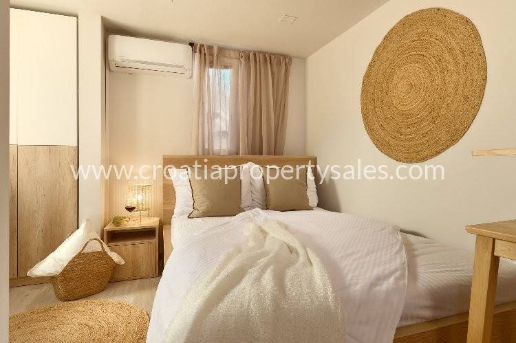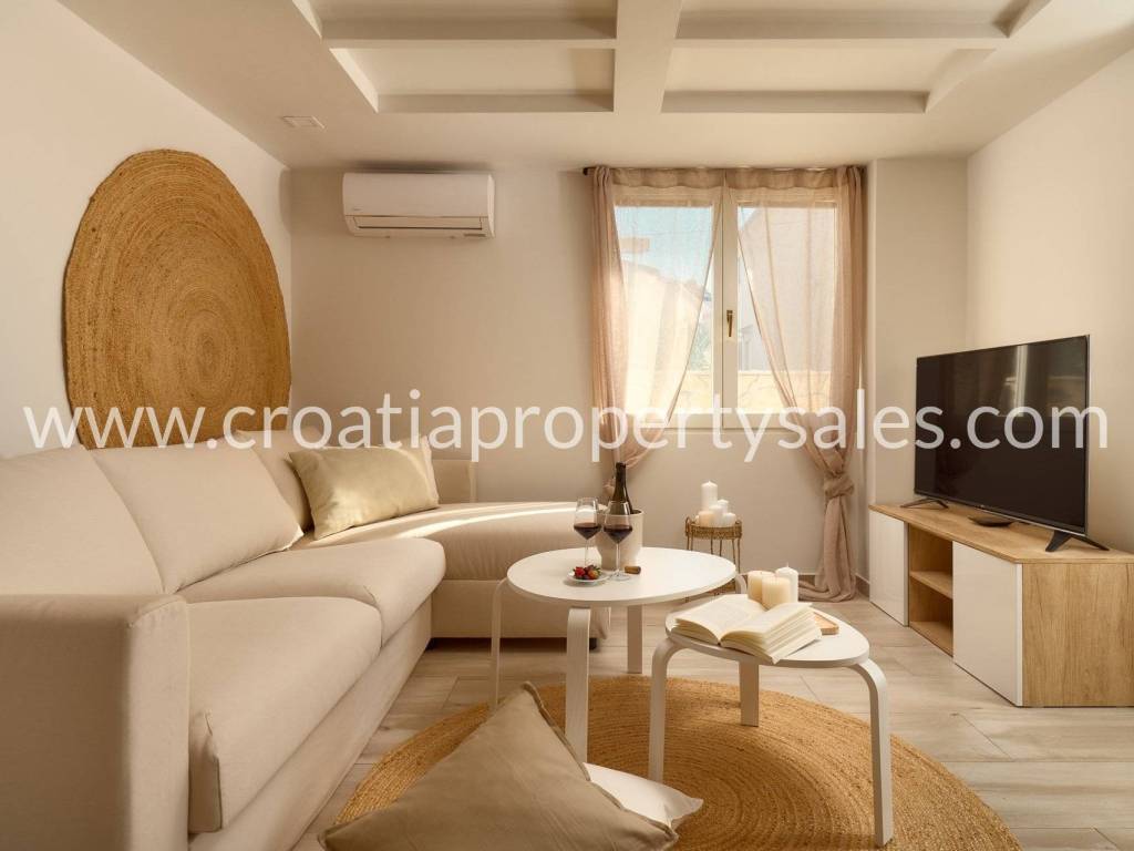 Samostojeća kuća apartmanskog tipa s bazenom. Renovirana je 2024., te uređena s mnogo stila. Smještena je na atraktivnoj lokaciji 50 m od mora i blizu prekrasnih plaža. Ukupna površinakuće je 150m2 i ima tri etaže. U prizemlju se nalazi velika sprema i praonica rublja. Na prvoj etaži nalaze se dva jednosobna apartmana s terasom. Na drugoj etaži nalazi se jednosoban apartman i terasa. Obje terase imaju prekrasan pogled na more i zasigurno će biti omiljeno mjesto za sjedenje budućim vlasnicima. Dvorište s bazenom također je ugodno mjesto za boravak, okruženo je visokim zidom te osigurava privatnost. Ova nekretnina ima 2 parkirna mjesta.