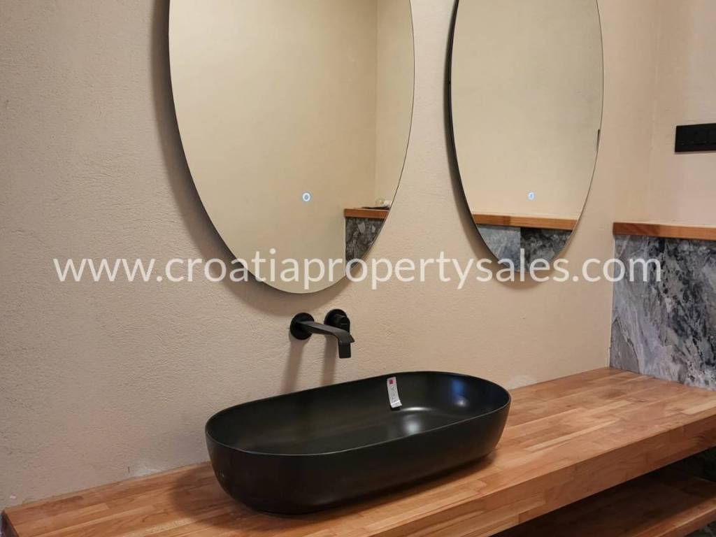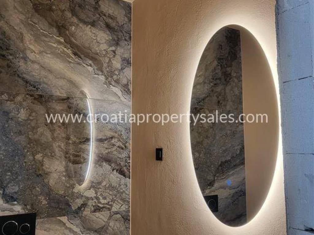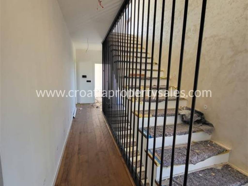 Stepenice obložene drvom vode na prvi kat površine 149 m2 gdje se nalaze 3 spavaće sobe svaka sa svojom kupaonicom i terasom. Na drugom katu površine 102 m2 se nalazi glavna spavaonica s kupaonicom i velika natkrivena i nenatkrivena terasa.