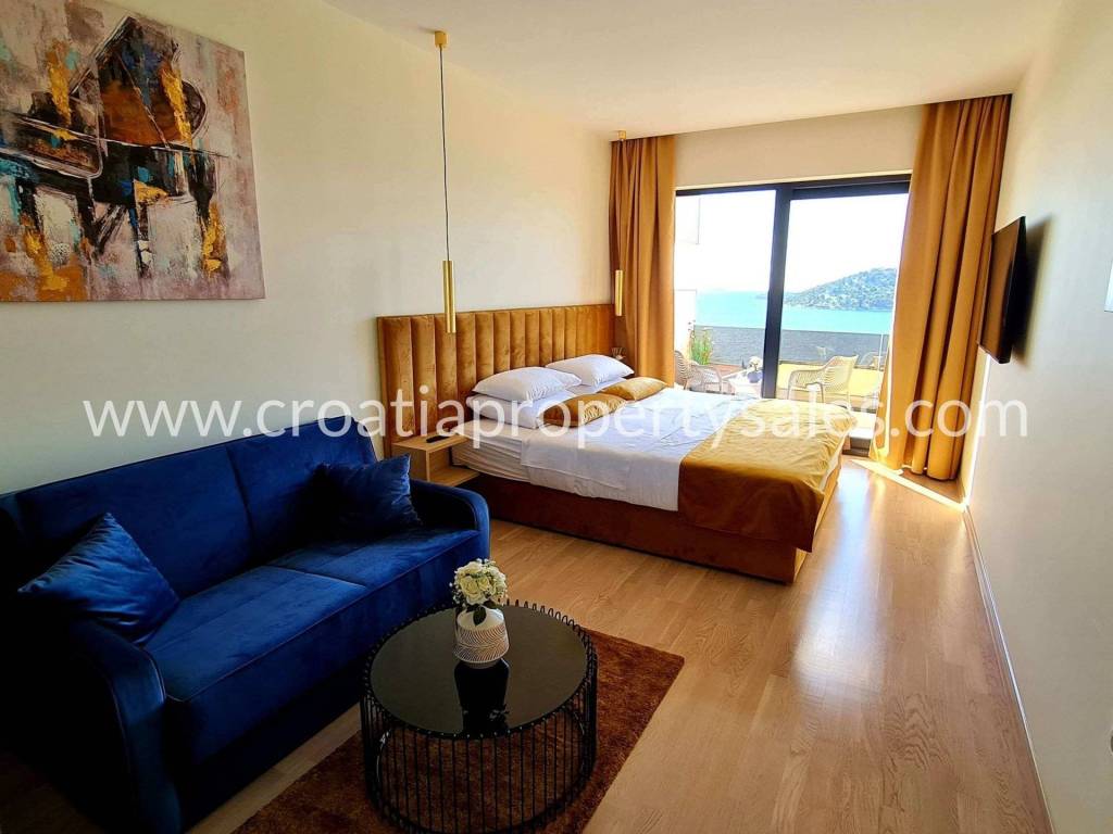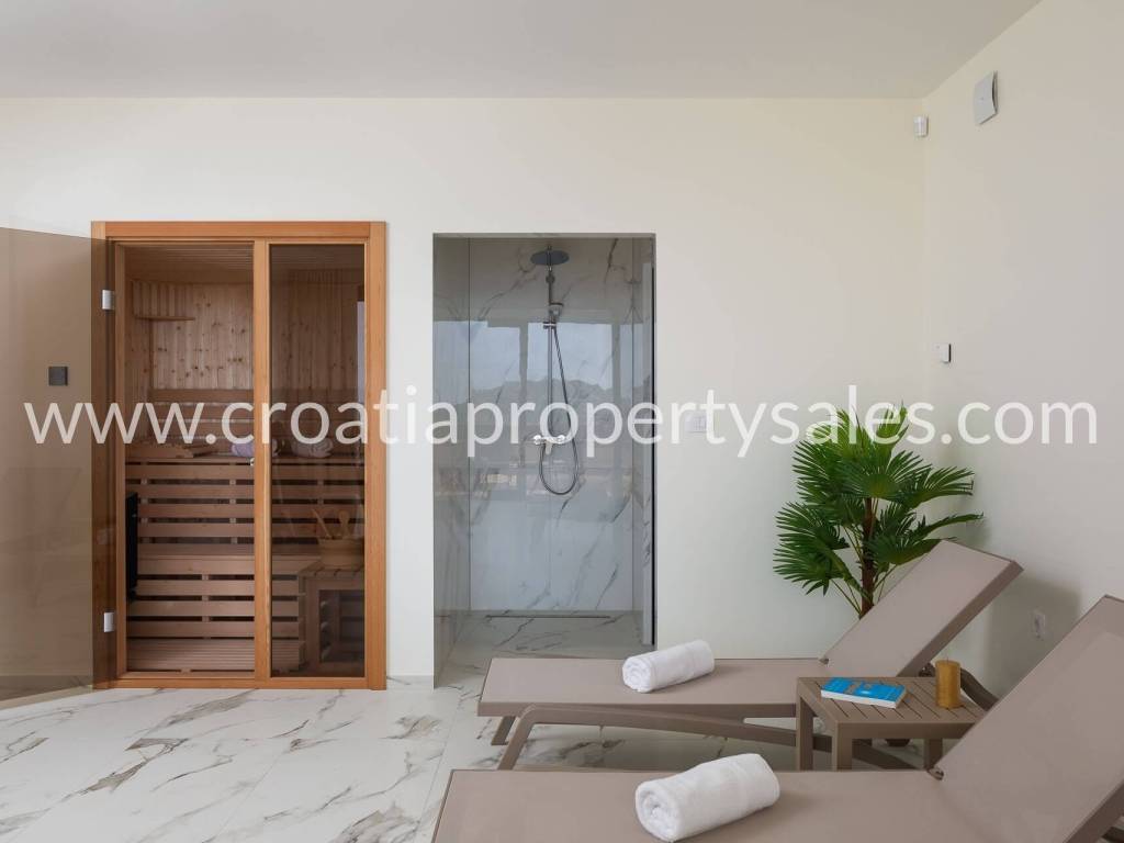 Na prvom katu se nalaze četiri luksuzno opremljene sobe s izlazom na balkon, pogledom na more i vlastitom kupaonicom.