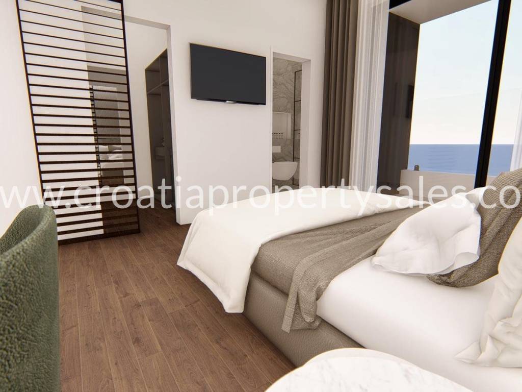 Prvi kat ima 182 m2, a sastoji se od 5 spavaćih soba, od kojih svaka ima svoju kupaonicu. Iz master sobe se izlazi na terasu od 34 m2, s koje se pruža panoramski pogled na Kaštelanski zaljev i Split.