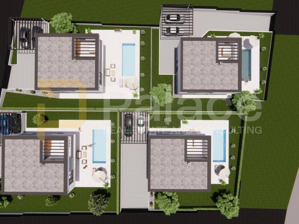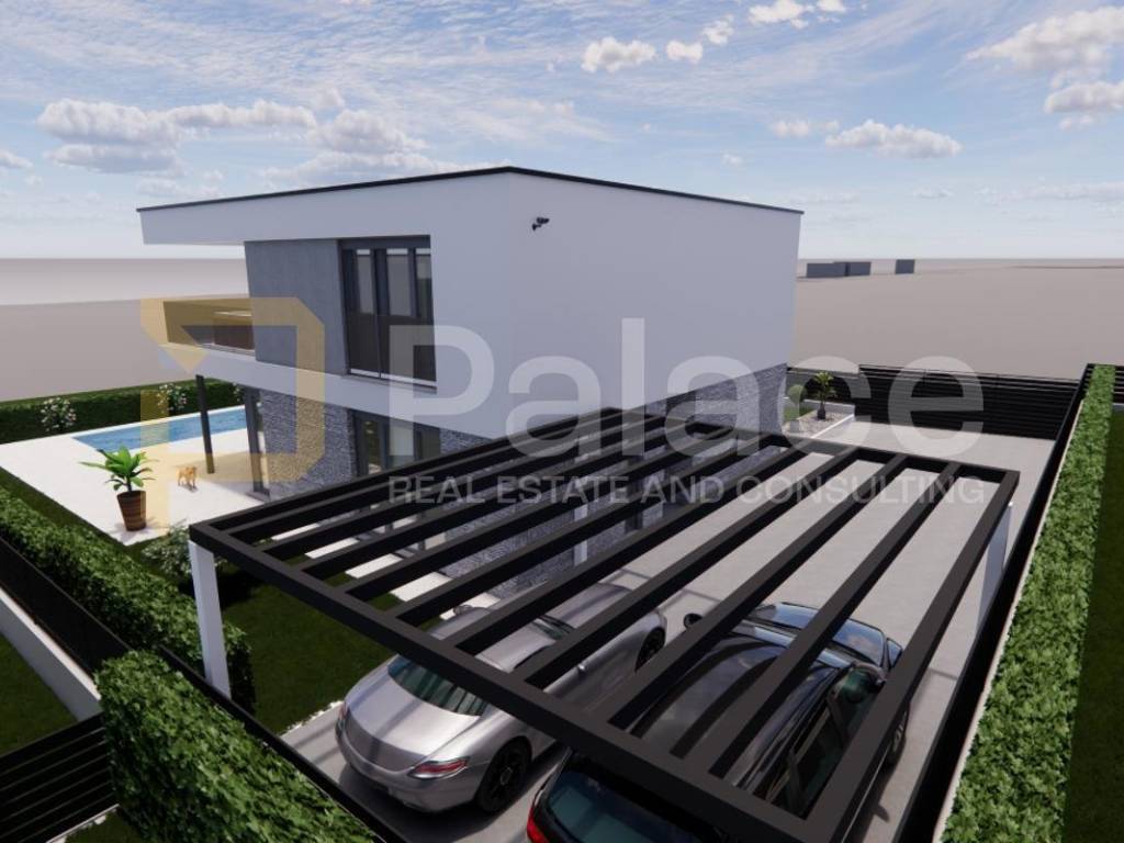 Eksterijer vile upotpunjen je bazenom i dva parkirna mjesta natkrivena pergolom, a parcela nudi dovoljno prostora i privatnosti za dodatno uređenje po želji vlasnika.