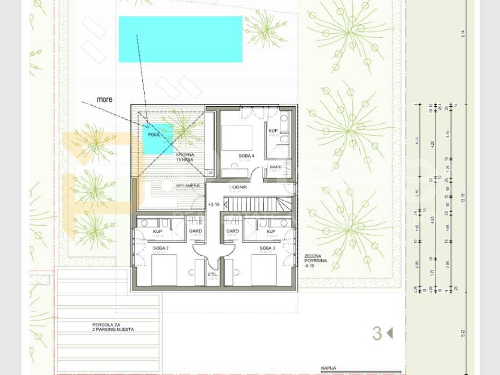 Na prvom katu nalaze se tri prostrane spavaće sobe, svaka s privatnom kupaonicom i garderobom, čime je osigurana iznimna udobnost za sve stanovnike i goste. Na ovoj etaži predviđen je i wellness prostor za trenutke opuštanja, dok krovna terasa od 20 m nudi savršeno mjesto za uživanje u pogledu na more i miru okoline.
