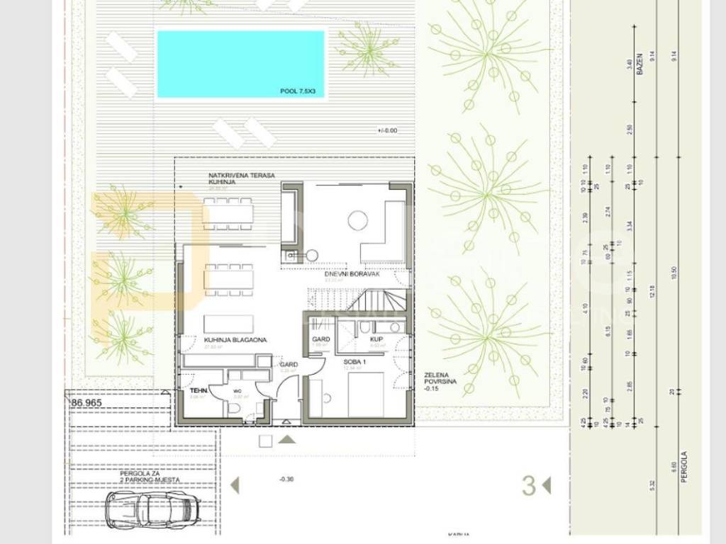 Dvorište je osmišljeno kako bi upotpunilo luksuzan dojam vile uključuje bazen i dva parkirna mjesta natkrivena pergolom, dok sama parcela nudi mnogo privatnosti i mogućnosti dodatnog uređenja.