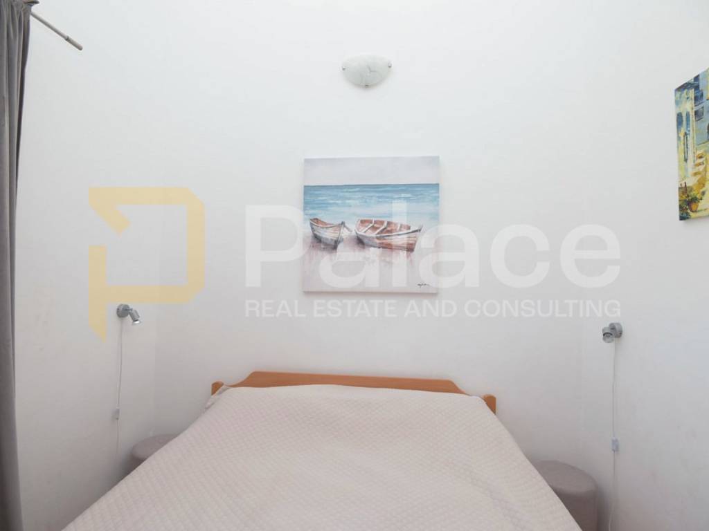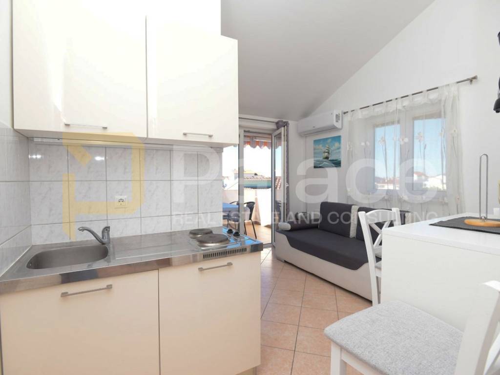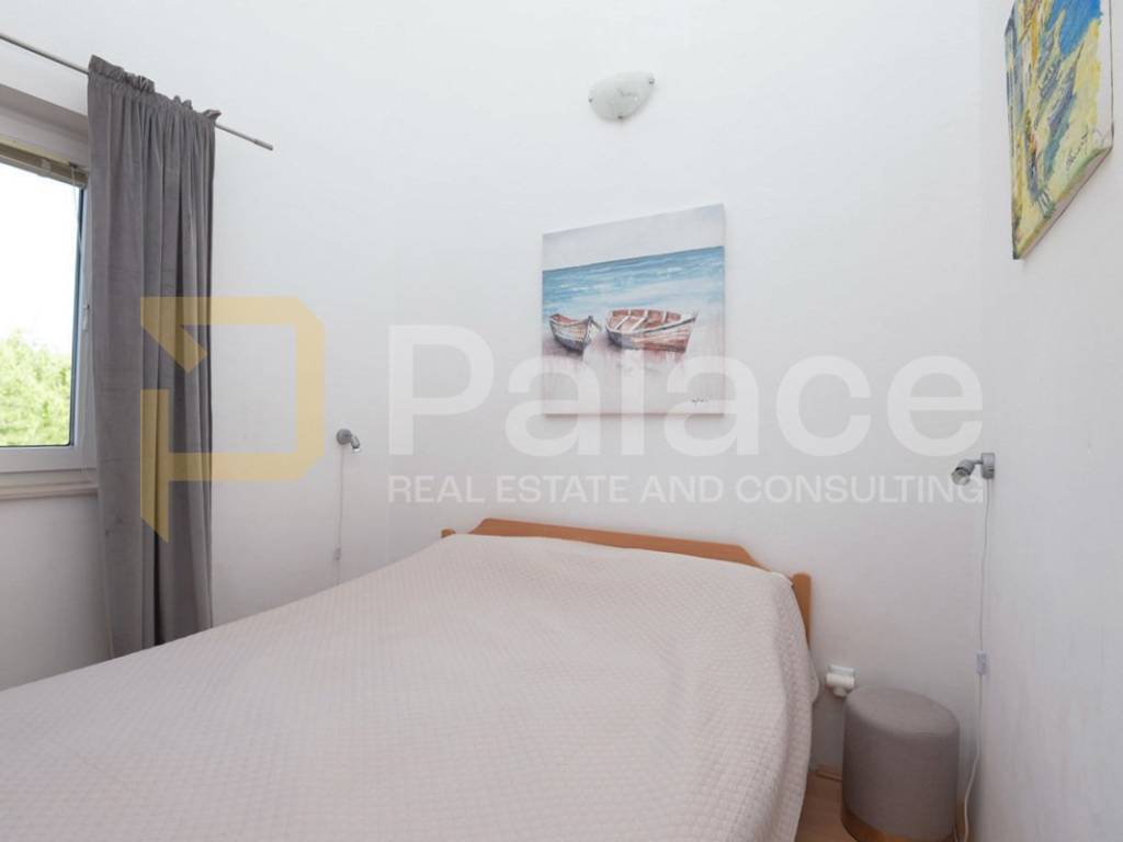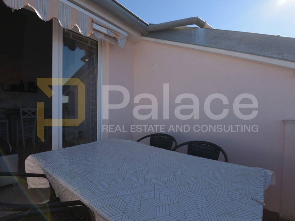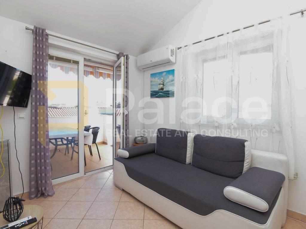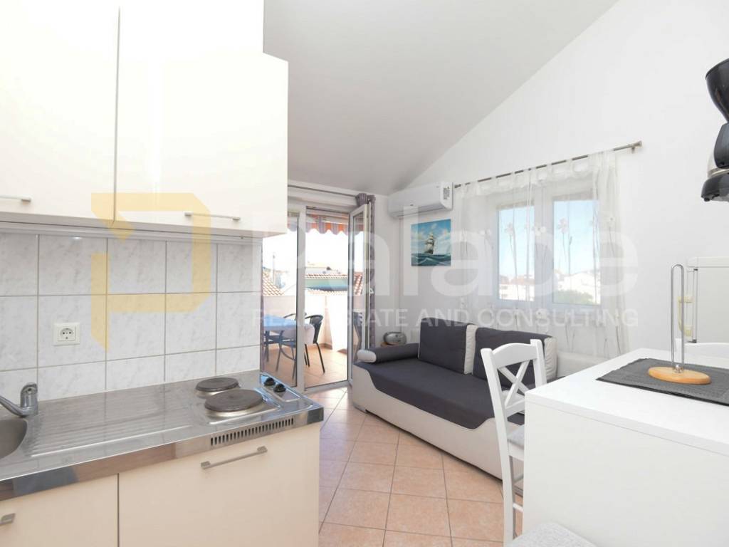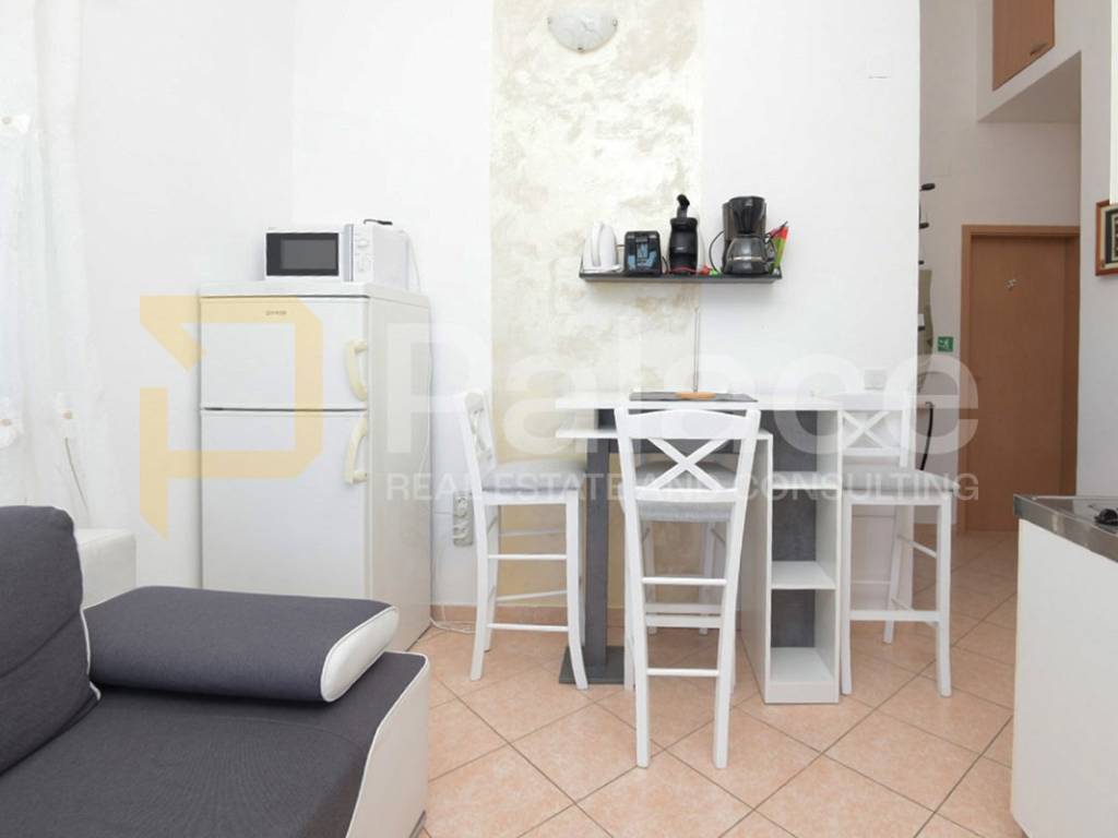 Stan se nalazi na zadnjem katu, u visokom potkrovlju, zgrade građene 2005. godine, te se na istoj etaži nalaze još dva stana. Sastoji se od hodnika, kupaonice, spavaće sobe, te kuhinje, blagovaonice i dnevnog boravka u jednom prostoru s izlazom na terasu. Stan je osunčan i izrazito topao, s visokim stropovima što daje dodatnu prostranost stanu, te s djelomičnim pogledom na more. Koristio se za turistički najam stoga se može preuzeti uhodano poslovanje ili nekretninu koristiti za život.