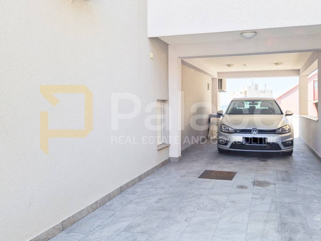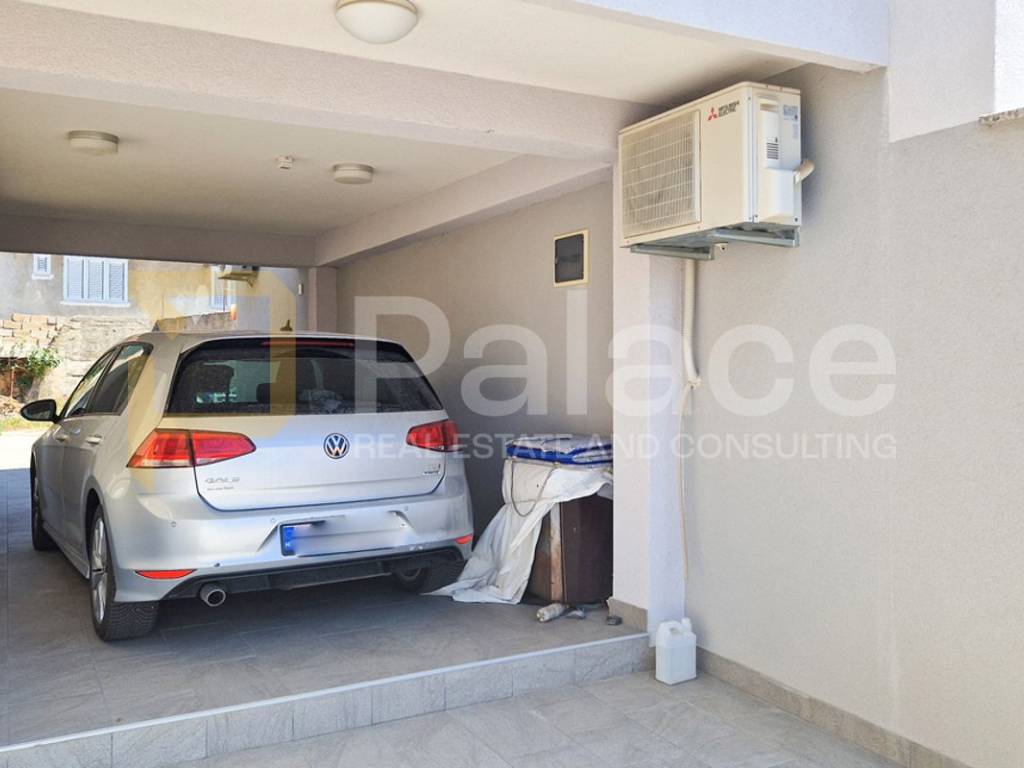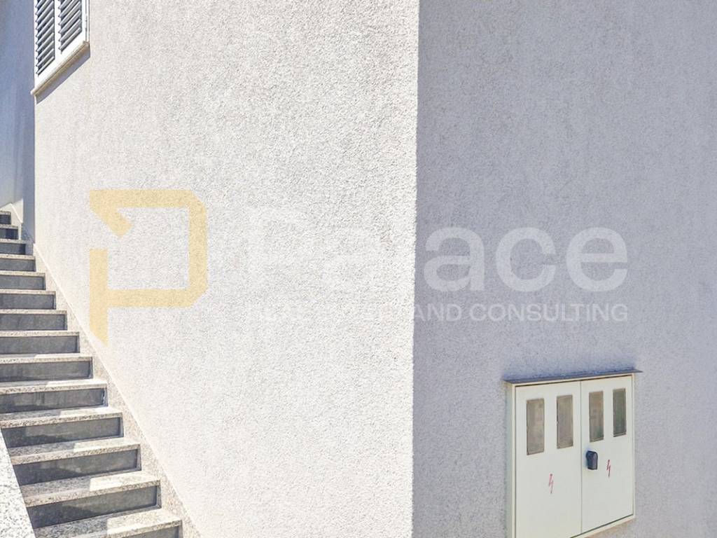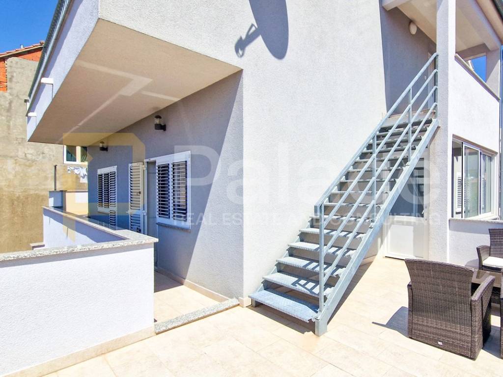Oko cijelog kata se protežu prostrane i osunčane terase s pogledom na more. Ovom stanu pripadaju konoba (12,2 m2) i 2 spremišta (2-3 m2) u prizemlju kao i 2 natkrivena parkirna mjesta, te cijelo dvorište 222 m2 (stanari u prizemlju imaju pravo korištenja dvorišta).