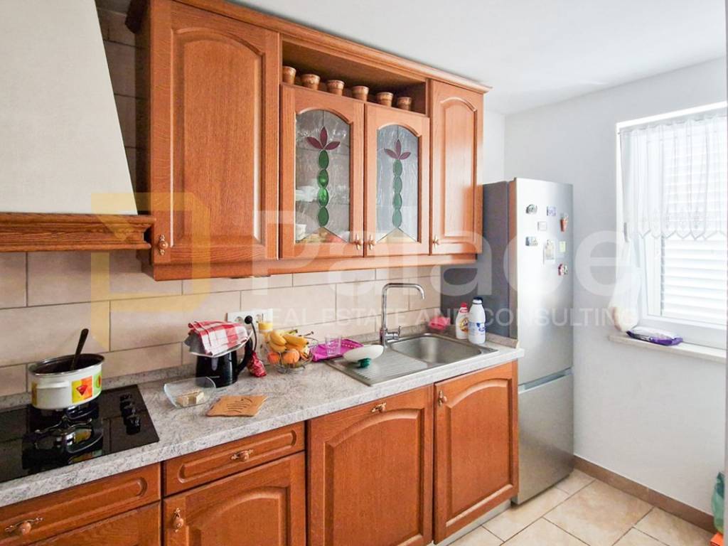 Stan se sastoji od ulazne verande, hodnika, čak 3 komforne spavaće sobe (14-15 m2), kupaonice (3,8 m2), kuhinje s blagovaonicom i dnevnim boravkom (15,3 m2). Stan je namješten i klimatiziran, kompletno nova termo fasada na kuću kao i krov je postavljena 2018. godine. Prije nekoliko godina je renovirana i kupaonica.