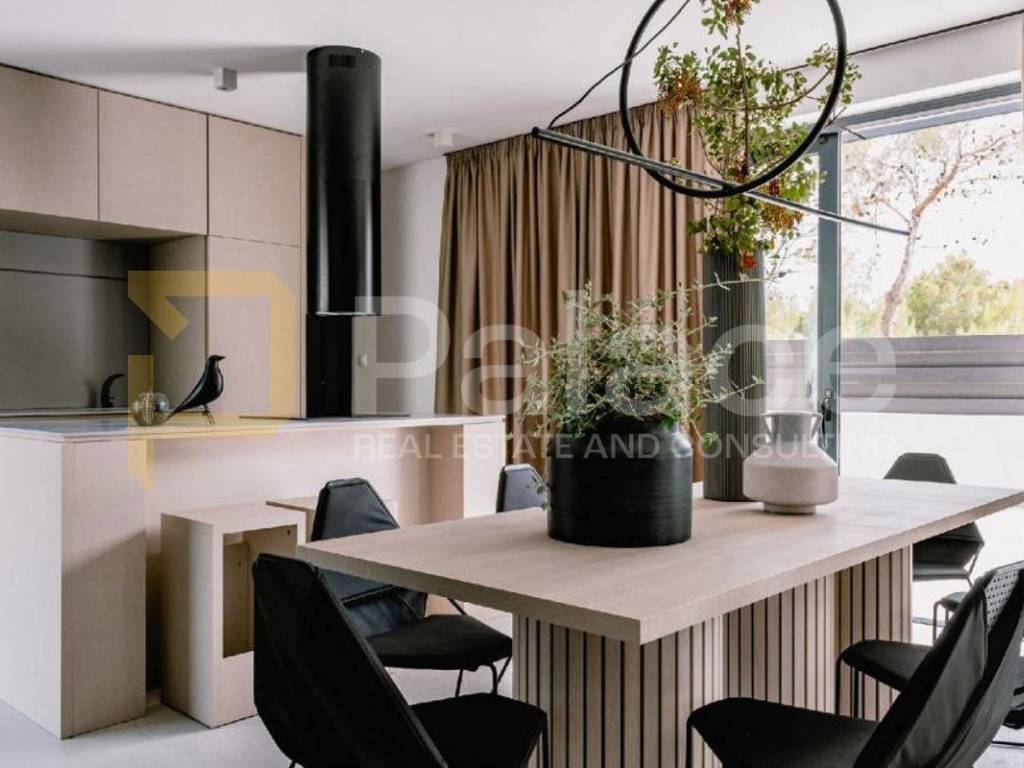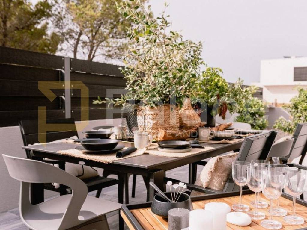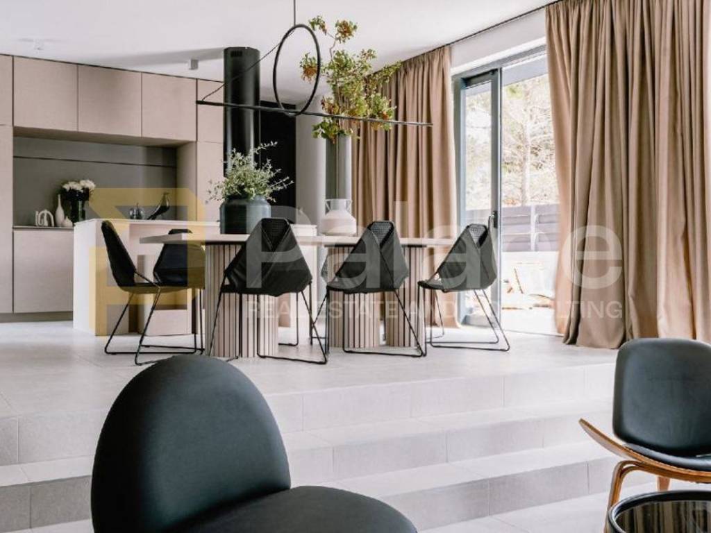 U prizemlju kuće je dnevni boravak te kuhinja i blagovaonica, spavaća soba i kupaonica. Iz istog se pruža izlaz u dvorište gdje se nalazi bazen, jacuzzi, roštilj i vanjski blagovaonski stol.