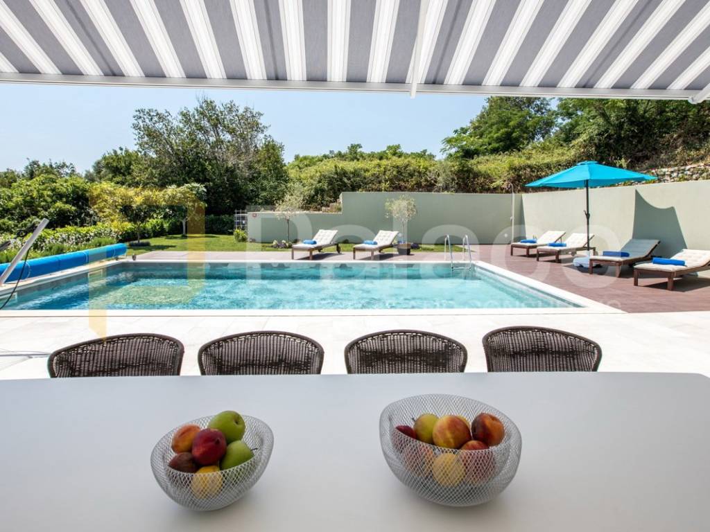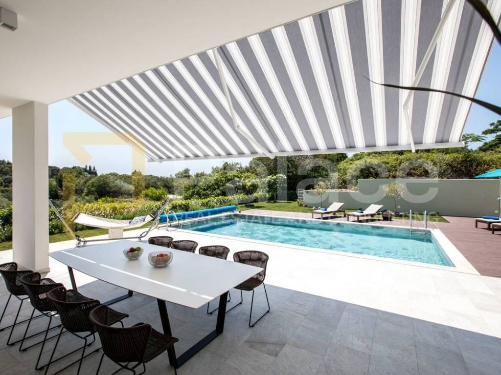 U vanjskom dijelu nalazi se bazen s protustrujnim plivanjem, sunčalište s vanjskim tušem, natkrivena terasa s roštiljem i blagovaonskim stolom te njegovan vrt. Na raspolaganju je garaža za dva automobila, kao i dodatna dva parkirna mjesta ispred vile.