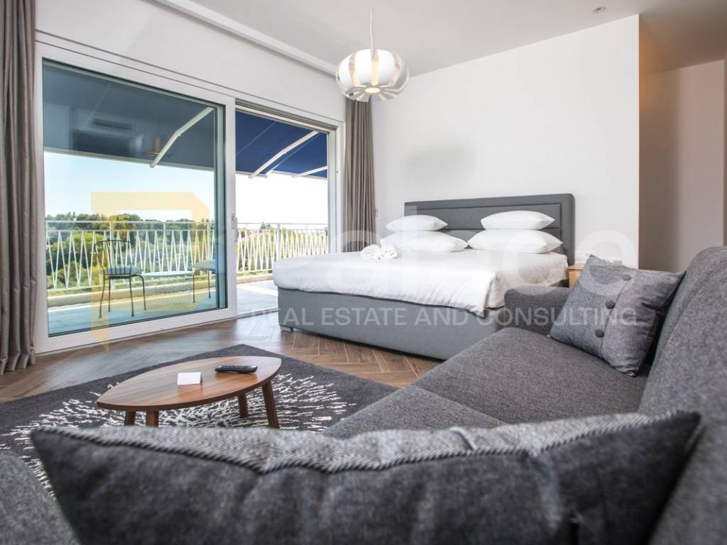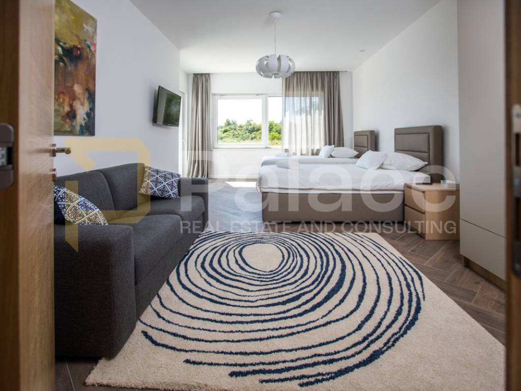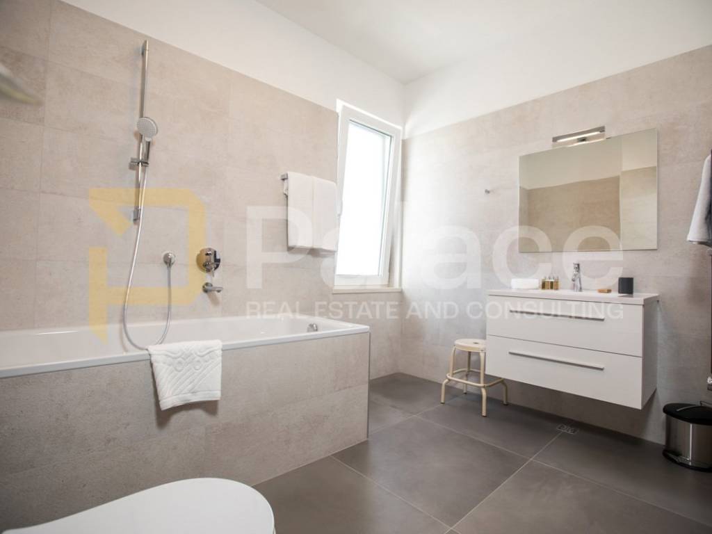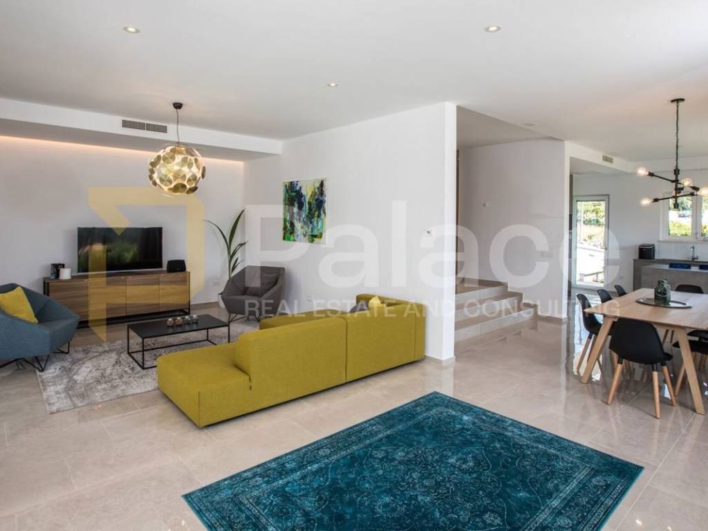 Na gornjoj etaži nalaze se četiri prostrane spavaće sobe, svaka s vlastitom kupaonicom, garderobom i izlazom na balkon. Donja etaža obuhvaća prostran dnevni boravak, moderno opremljenu kuhinju s blagovaonicom te dodatni prostor za rekreaciju.