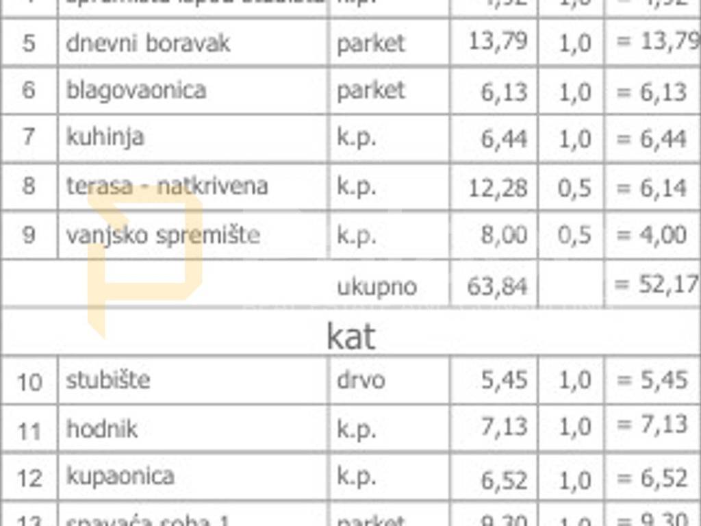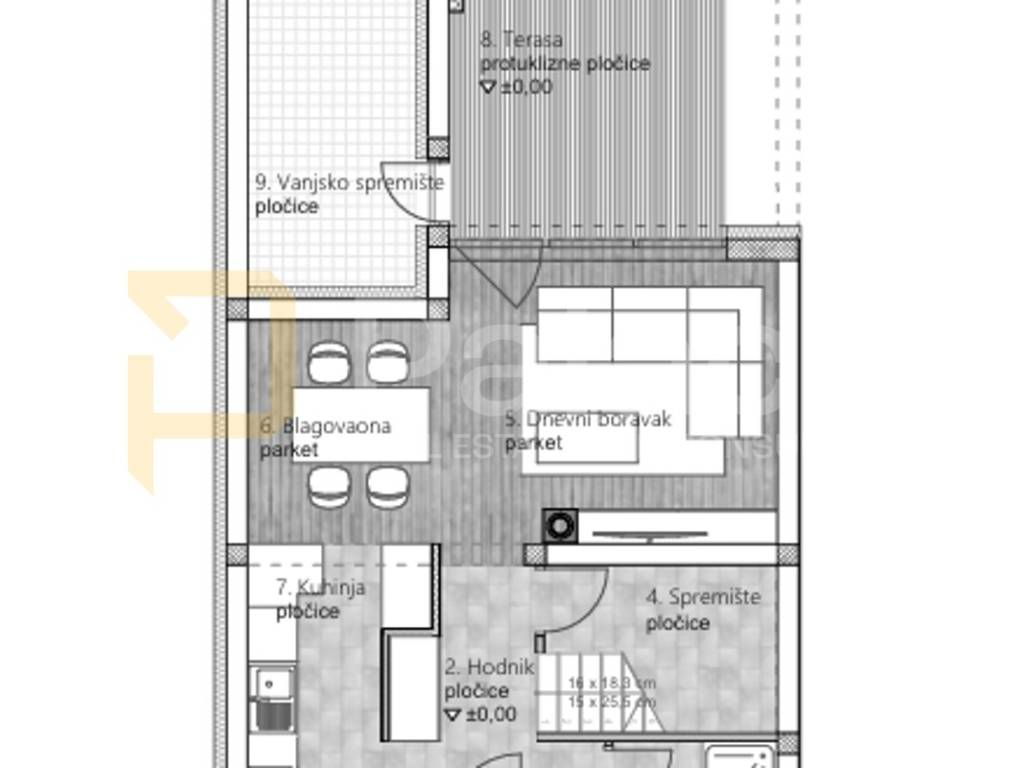PRIZEMLJE: natkriveni ulaz, hodnik, WC, spremište ispod stubišta, dnevni boravak, blagovaonica, kuhinja, natkrivena terasa, vanjsko spremište