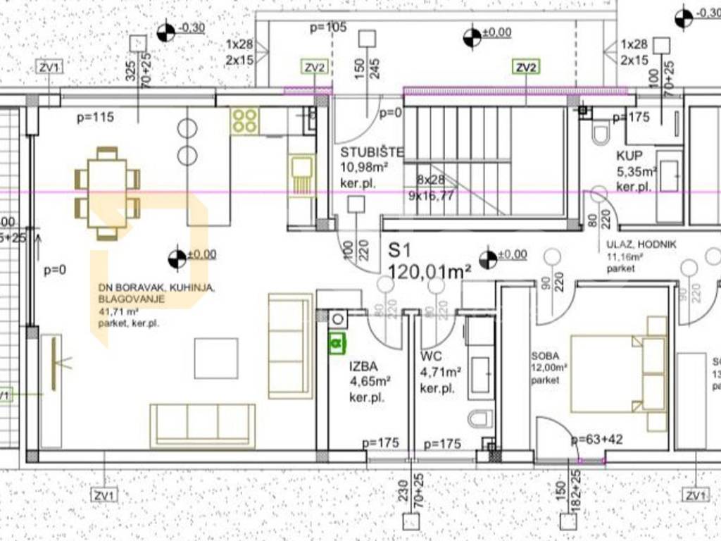 Stan je ukupne površine 120 m2 u prizemlju a sastoji se od velikog dnevnog boravaka s predsobljem, kuhinje, blagovaone, izbe, hodnika, tri spavače sobe, WC-a, kupaone s WC-om, terasom i izlazom u vrt.