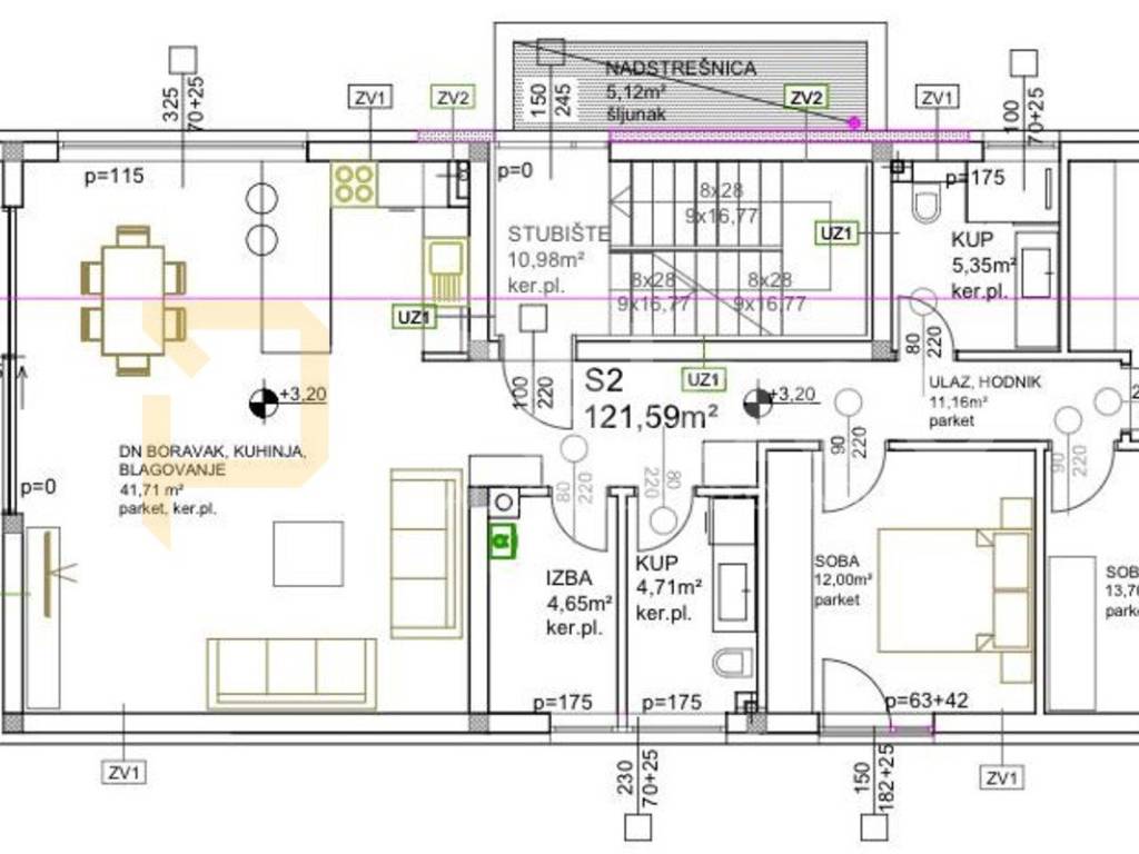 Stan je ukupne površine 122 m2 u prizemlju a sastoji se od velikog dnevnog boravaka s predsobljem, kuhinje, blagovaone, izbe, hodnika, tri spavače sobe, WC-a, kupaone s WC-om, terasom.