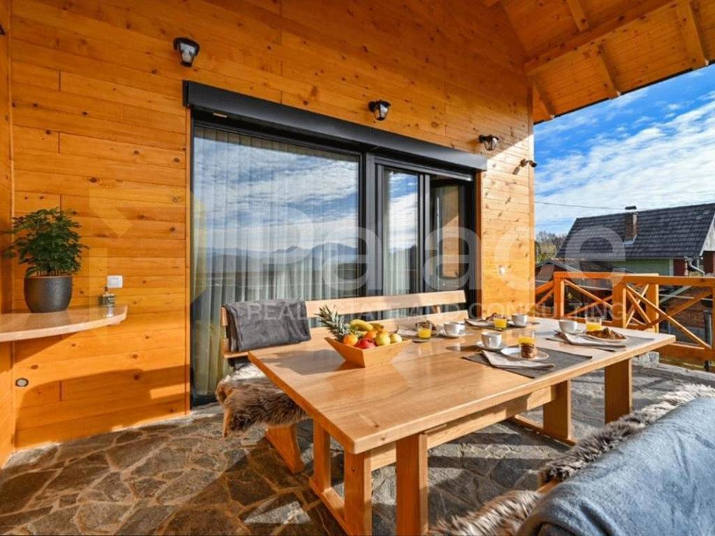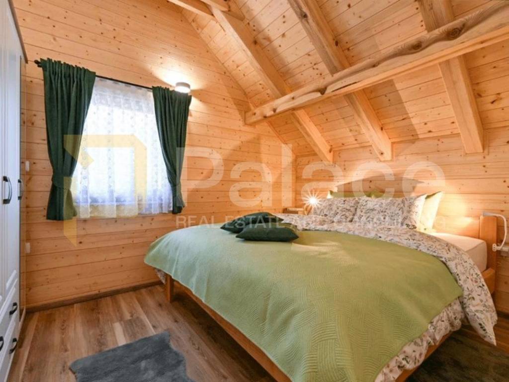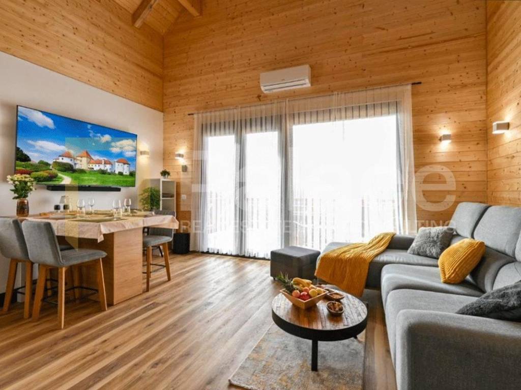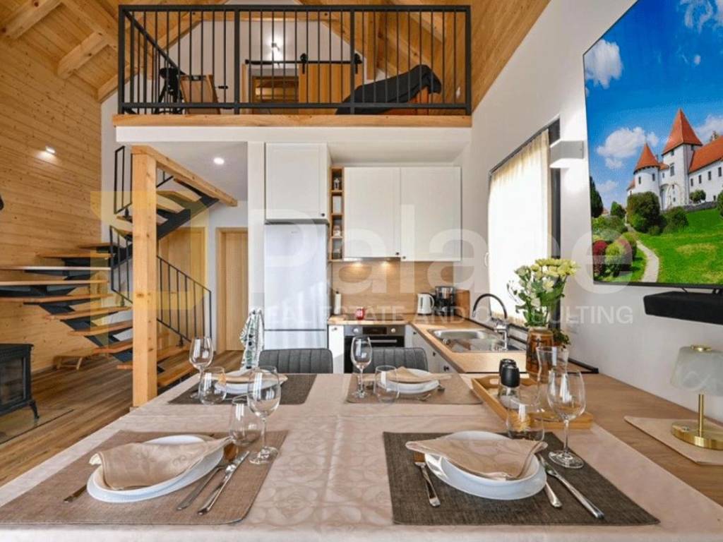 Na prodaju je luksuzna drvena kuća za odmor površine 100 m2 i okućnice od 700 m2. Smještena je nedaleko grada Varaždina, u mjestu Lovrečan.