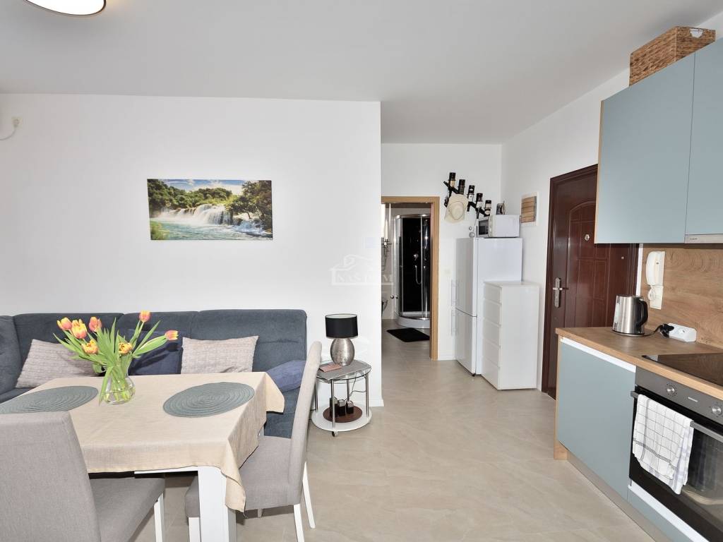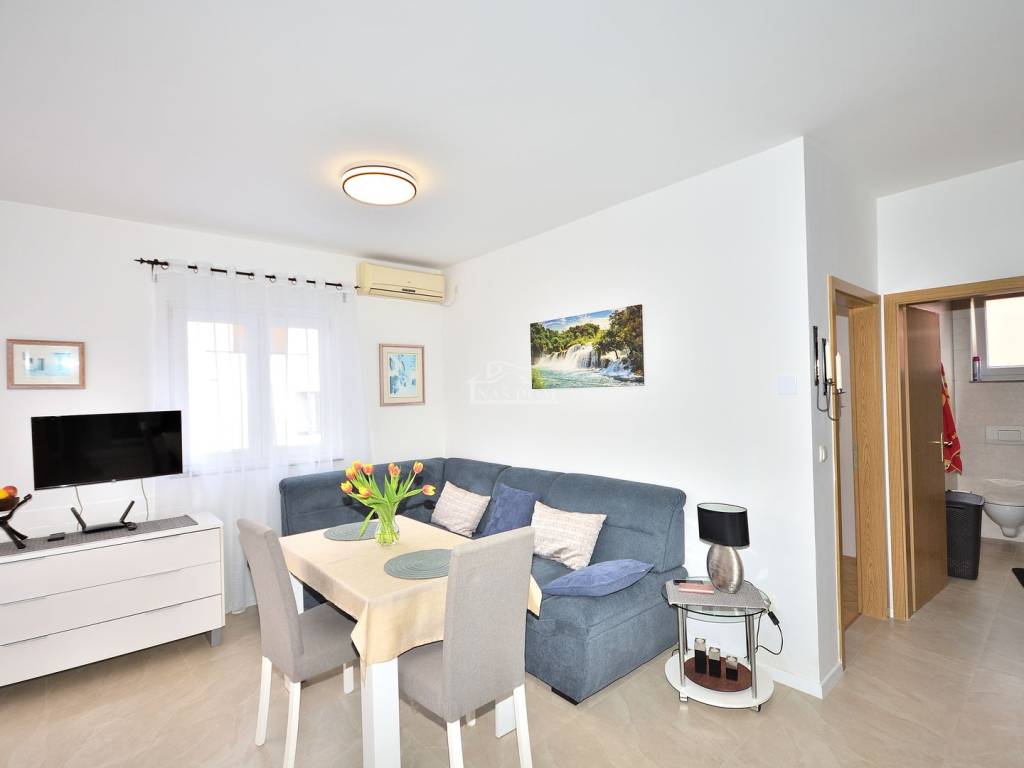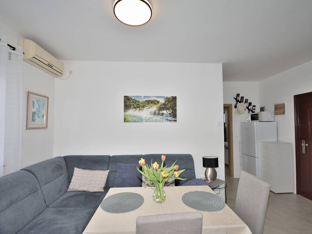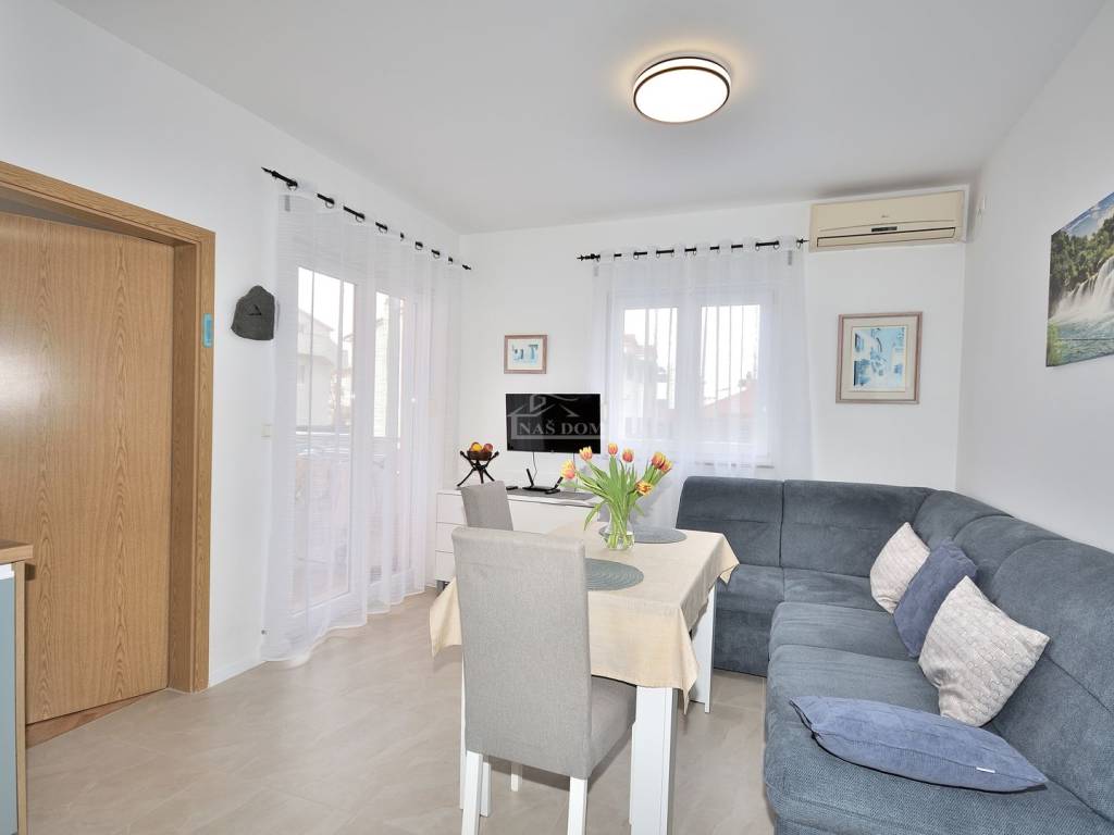 Vodice - prodaje se namješten dvosoban stan na mirnoj lokaciji. Stan se nalazi u visokom prizemlju manje stambene zgrade i ima ukupnu korisnu površinu 48,20 m2. Sastoji se od ulaz, dvije spavaće sobe, kupaonica, kuhinja s blagovaonicom i dnevni boravak i balkon. Stan je renoviran 2025 godine kad je kompletno renovirana kupaonica, instalirano električno podno grijanje u kupaonici, kuhinji i dnevnom boravku, nova keramika u kuhinji i dnevnom boravku, nova kuhinja... Stan je kompletno namješten, klimatiziran i pripada mu jedno parkirno mjesto površine 12,50m2. Zgrada se nalazi na mirnoj lokaciji, u slijepoj ulici, od najbliže plaže udaljena oko 600 m a od centra Vodica oko 1200 m.