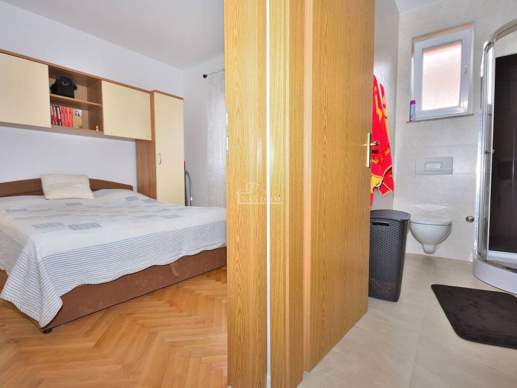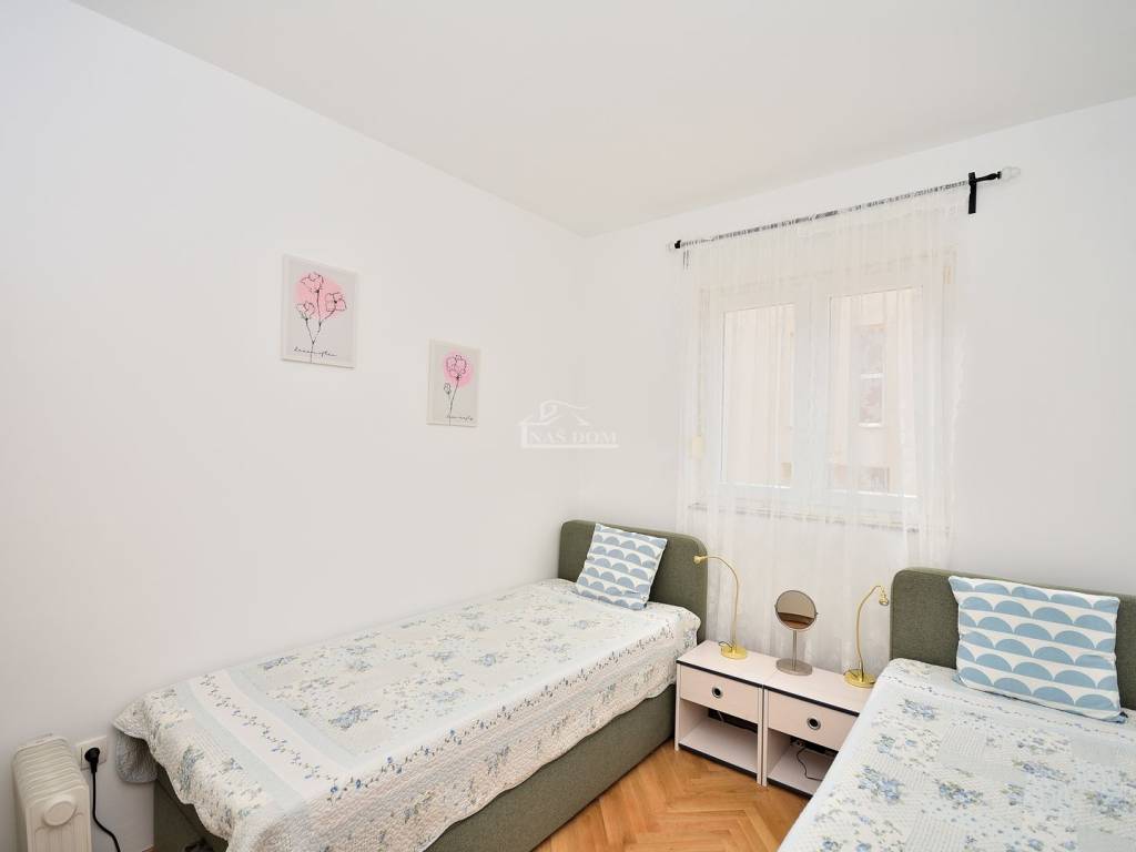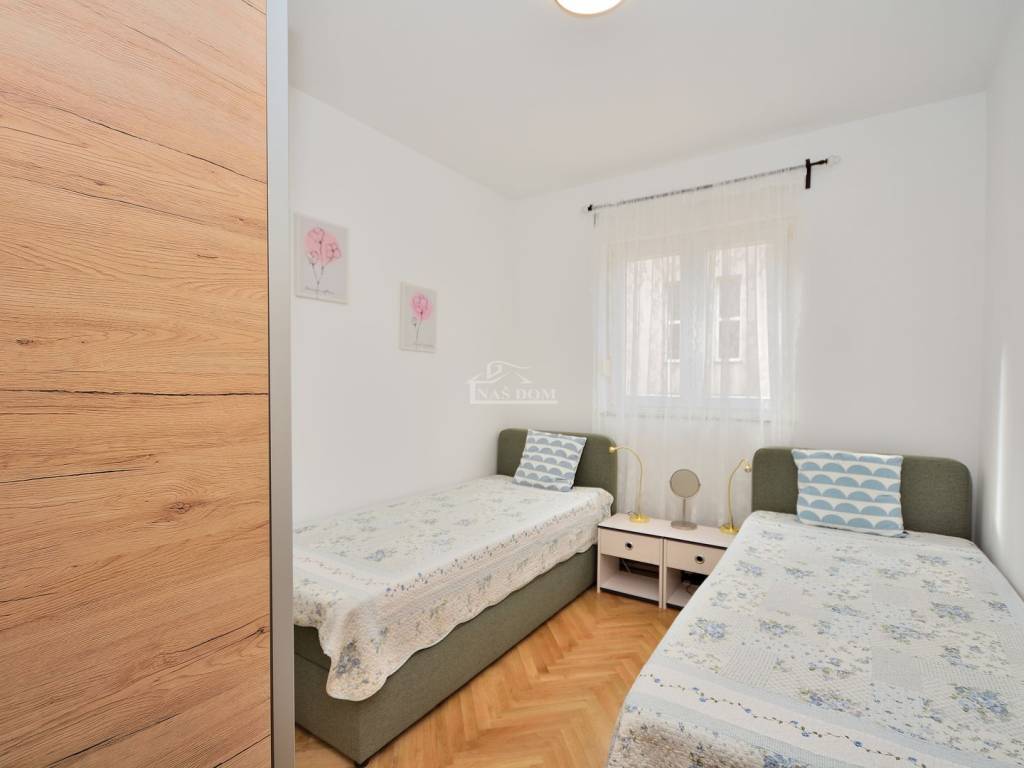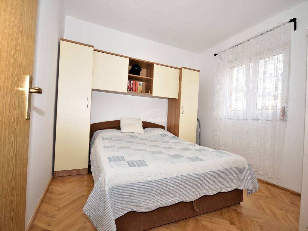 Vodice - prodaje se namješten dvosoban stan na mirnoj lokaciji. Stan se nalazi u visokom prizemlju manje stambene zgrade i ima ukupnu korisnu površinu 48,20 m2. Sastoji se od ulaz, dvije spavaće sobe, kupaonica, kuhinja s blagovaonicom i dnevni boravak i balkon. Stan je renoviran 2025 godine kad je kompletno renovirana kupaonica, instalirano električno podno grijanje u kupaonici, kuhinji i dnevnom boravku, nova keramika u kuhinji i dnevnom boravku, nova kuhinja... Stan je kompletno namješten, klimatiziran i pripada mu jedno parkirno mjesto površine 12,50m2. Zgrada se nalazi na mirnoj lokaciji, u slijepoj ulici, od najbliže plaže udaljena oko 600 m a od centra Vodica oko 1200 m.