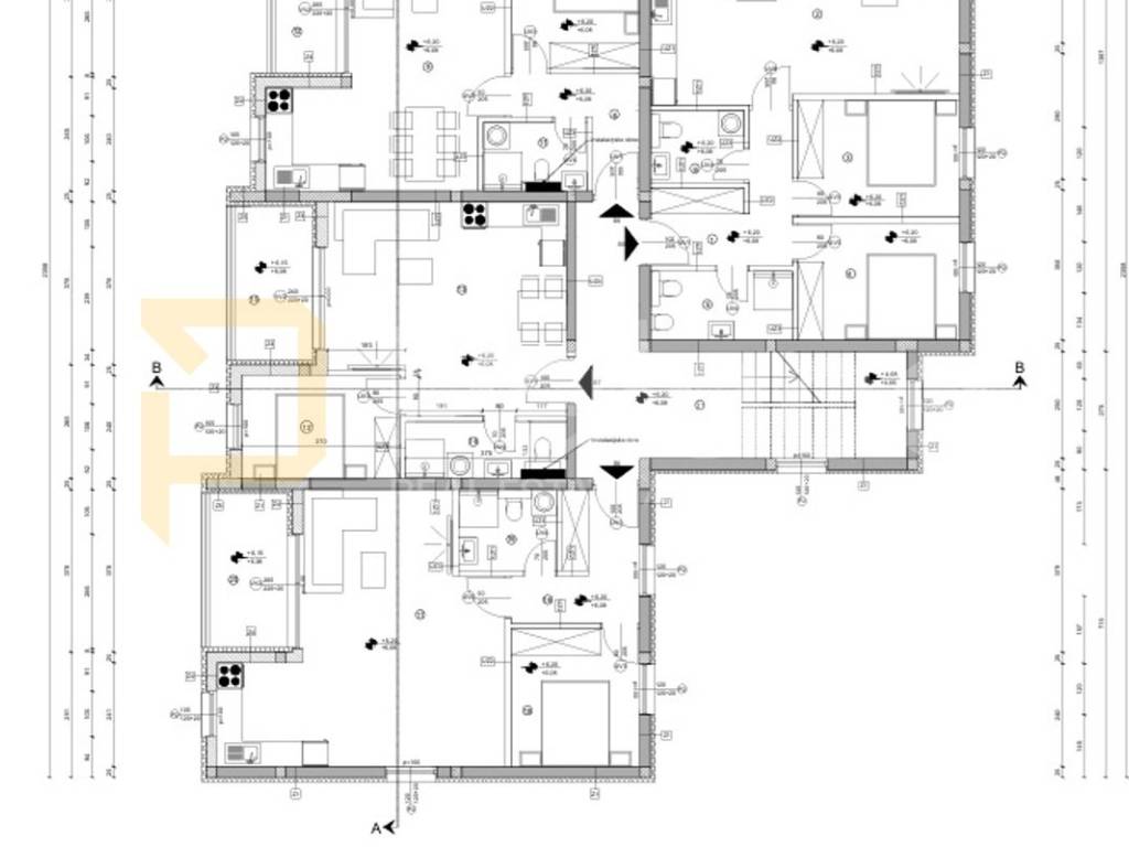 Na udaljenosti 1150 m od mora nalazi se parcela na kojoj je pokrenuta gradnja manje zgrade. Sastoji se od 8 stanova, na tri etaže.