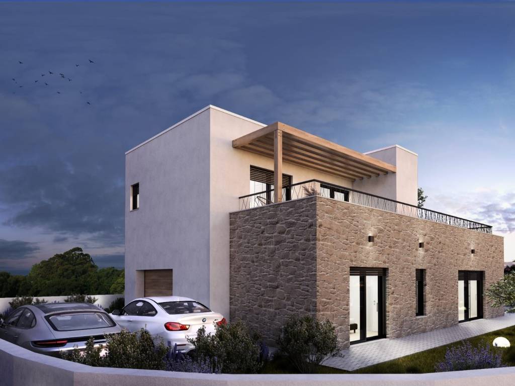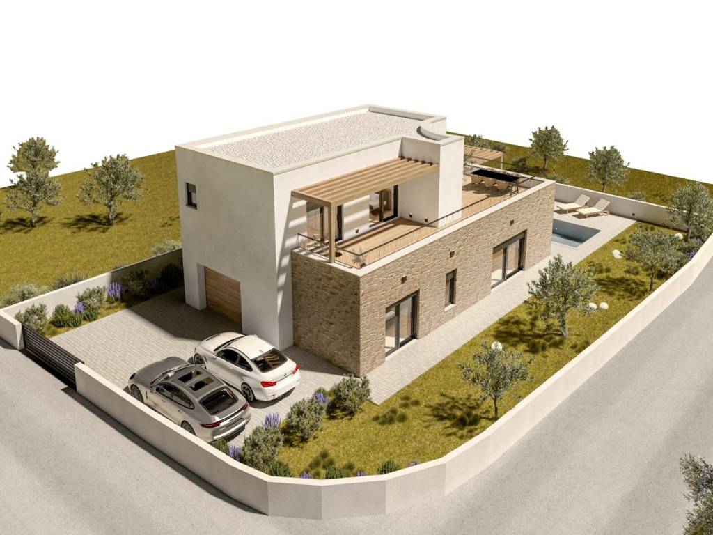 Estetski osmišljenim unutarnjim stubištem, pristupa se gornjoj etaži. Stambena neto kvadratura prvog kata iznosi 61,80 m2, a sadrži dvije spavaće sobe i dvije kupaonice.Posebna karakteristika ove vile jest velika dijelom natkrivena terasa, veličine 52 m2 ( što čini 15,80 m2 ukupne stambene neto površine, sa pripadajućim koeficijentima), a koja se proteže cijelim prvim katom i kojoj se može pristupiti i iz spavaćih soba. U prizemlju vile također se nalazi garaža veličine 35m2, a omogućena su i vanjska parkirna mjesta. Kuća ima i okućnicu u sklopu koje je smješten i bazen veličine 19 m2, sa vanjskim tušem i prostorom za druženje.