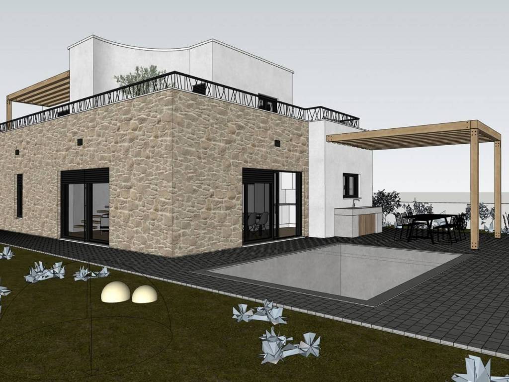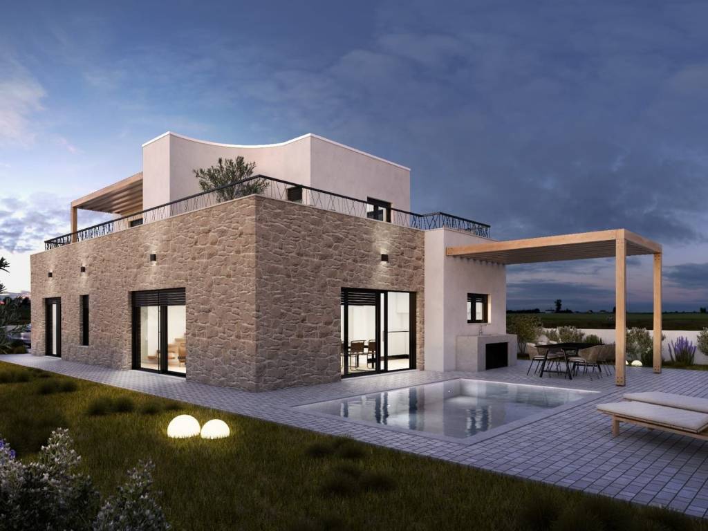 Vila se prostire na dvije etaže, prizemlje i prvi kat, ukupne neto stambene površine (sa pripadajućim koeficijentom vanjskih površina) 176 m2. U prizemlju vile, ukupne veličine 114,60 m2, nalazi se open space koncept kuhinje s blagovaonicom i dnevnim boravkom veličine 45 m2, spavaća soba i kupaonica, te wc i spremište. Dnevni boravak daje osobiti karakter cijelom prostoru. Visoki stropovi, zaobljeni lukovi i direktan izlaz na terasu u dvorište s bazenom, daju ovom prostoru posebnu dimenziju.