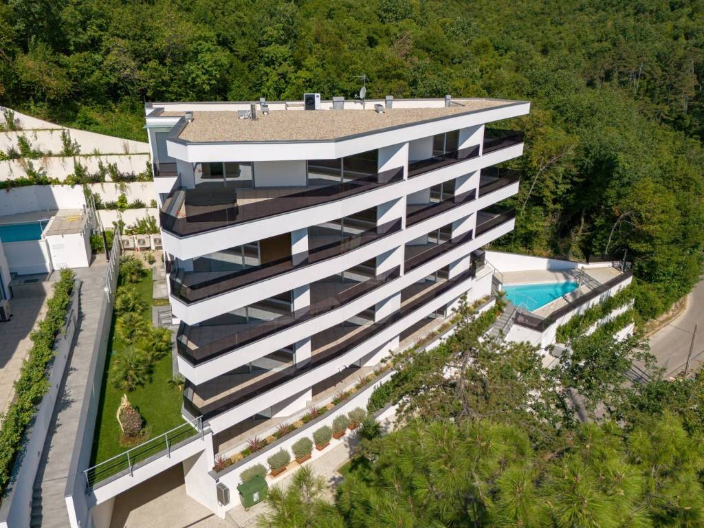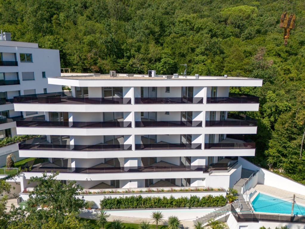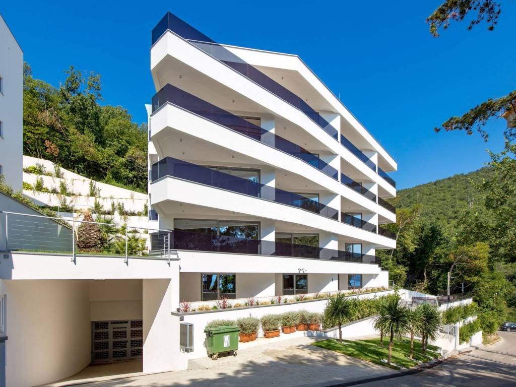 Penthouse zauzima kompletnu etažu novogradnje u jednoj od najprestižnijih lokacija Opatije okružene zelenilom i ispunjene mirisom borove šume. Do plaže i centra je 10minuta hoda i tek 2 minute vožnje. Ovo je idealna lokacija za sve one koji žele blizinu centra a istovremeno žele uživati u mirnom i privatnom okruženju.