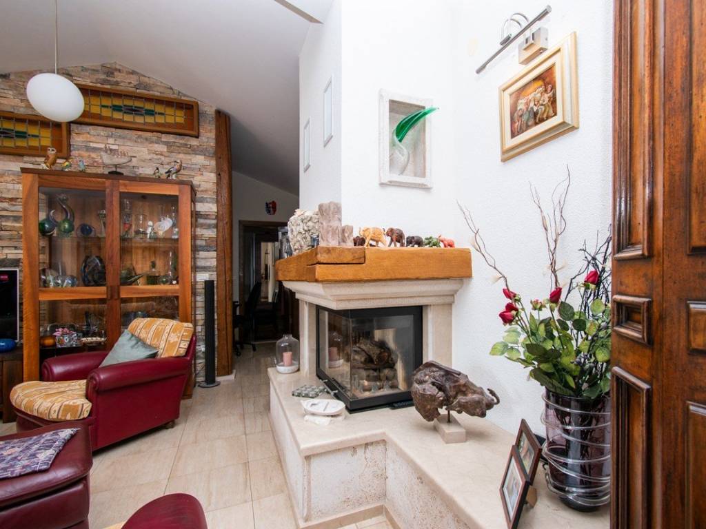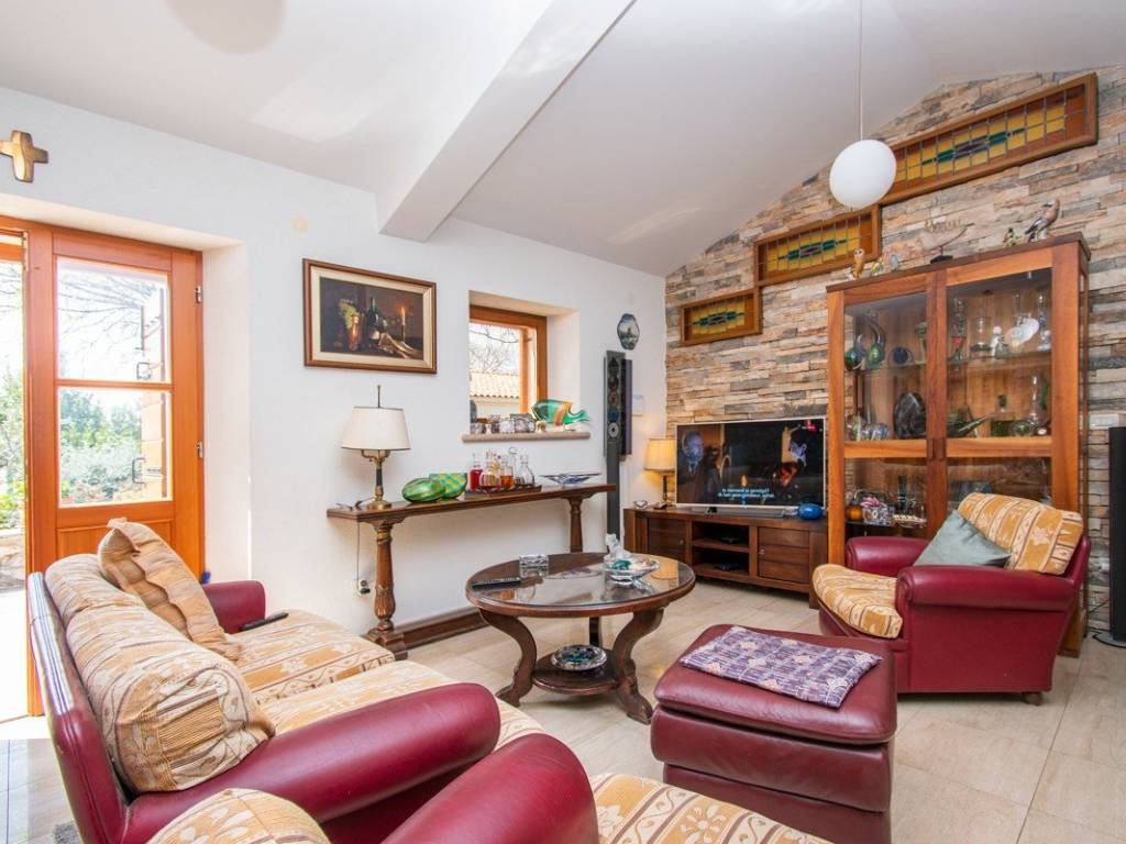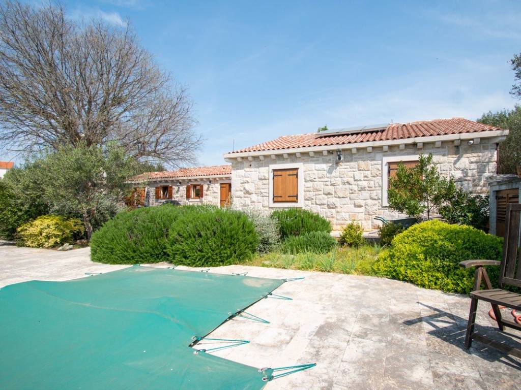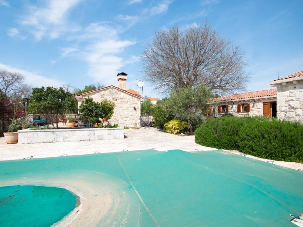 U imanje vas uvodi velika okućnica sa uređenim vrtovima u čijem se centru nalazi bazen koji vodi do glavnog objekta. Glavni objekt, neto površine 164 m2 ( ne uključujući potkrovlje i vanjske terase) sastoji se od prostrane kuhinje s blagovaonicom, dnevnog boravka s kaminom, tri spavaće sobe veličine cca 14m2 i pripadajućim kupaonicama, radne prostorije i velike ostave s potkrovljem.