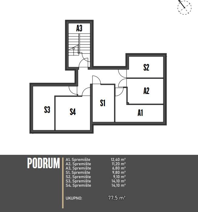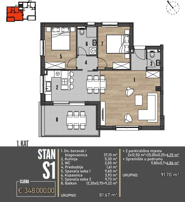 Stan ima ukupno 91,70 m2 korisne površine i sastoji se od kuhinje, blagovaone i dnevnog boravka u cjelini, balkona od 12,30 m2, hodnika, dvije spavaće sobe, kupaonice i WC-a. Također, stanu pripada spremište od 9,80 m2 u podrumu i dva parkirna mjesta.