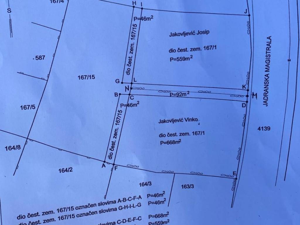 Ulaz na parcelu odmah s magistrale. Parcela je obrasla raslinjem i borovima.