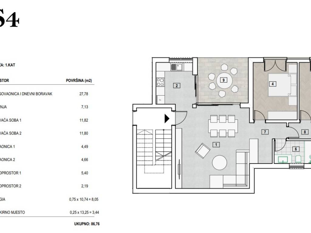 Ukupna stambena površina stana S4 na prvom katu iznosi 86,76 m2.