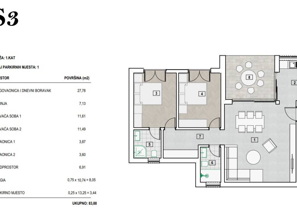 Ukupna stambena površina stana S3 na prvom katu iznosi 83,44 m2.