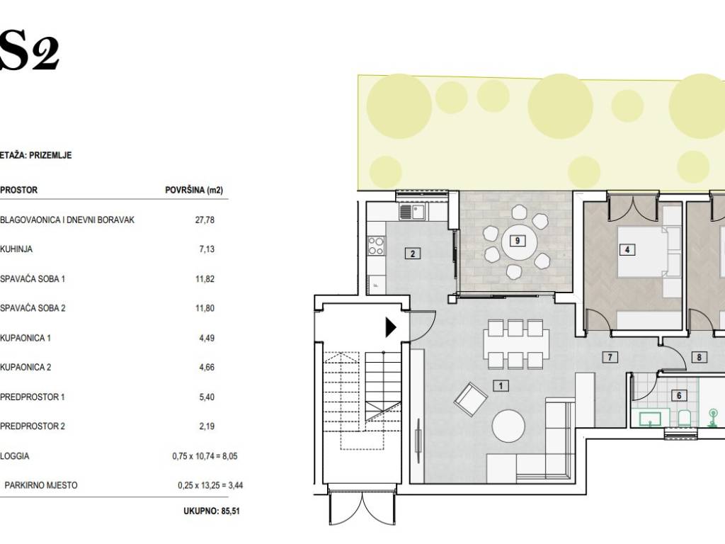 Ukupna stambena površina stana S2 u prizemlju iznosi 85,51 m2.
