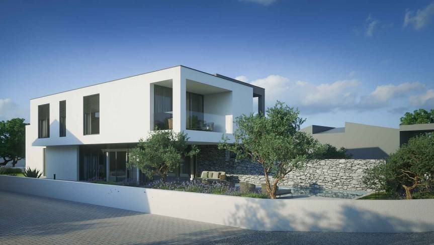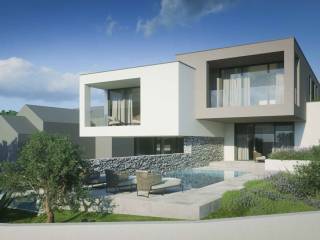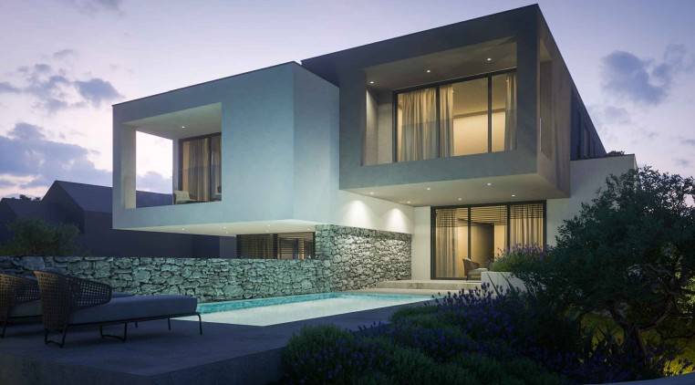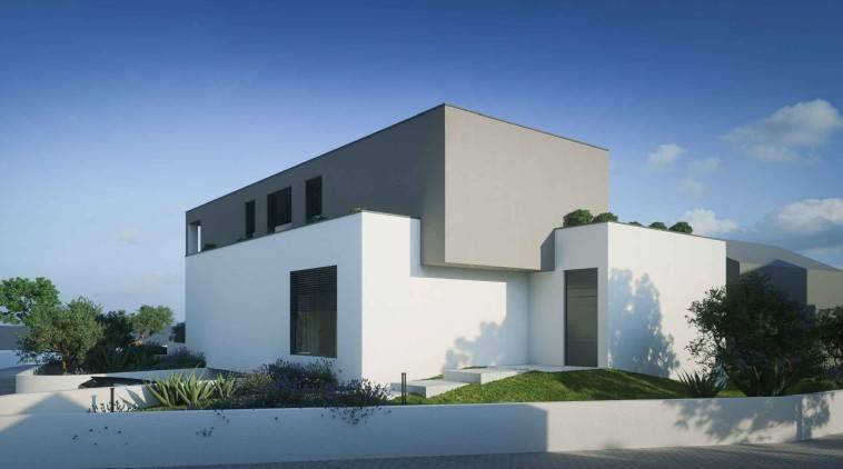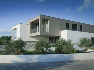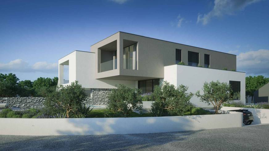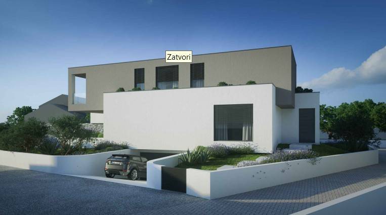 Cijela građevina je zamišljena kao objekt s dvije stambene jedinice. Glavni ulaz u građevinu je u prizemlju s sjeveroistočne strane. Ulazom u prizemlje se pristupa javnom dijelu građevine iz kojeg se može ulaziti u dva dvoetažna stana.Stanovi imaju dnevni boravak, blagovaonice, kuhinje i terase. U sklopu prizemne etaže su također i ostale popratne i sanitarne prostorije. Iz prizemlja se se jednokrakim unutarnjim stubištem pristupa se katu koji je zamišljen kao privatni dio stambene građevine, gdje su organizirane tri spavaće sobe gdje svaka ima svoju kupaonicu. Na sva pročelja će se postavljati silikatna žbuka u bijelom i smeđem tonu, također će se pojedini volumeni građevine naglasiti . Svi otvori prozora i vrata će biti aluminijska sa termo izvedbom u tonu po izboru projektanta. Zaštita od sunca izvest će se sa konzolnim istacima i elektčno podiznim alužaluzinama. S jugoistoćne strane se nalaze vanjski bazeni za svaki stan odvojeni pregradnim zidom. Garažna mjesta se nalaze u podrumu građevine a do njega se pristupa rampom s javne prometnice.