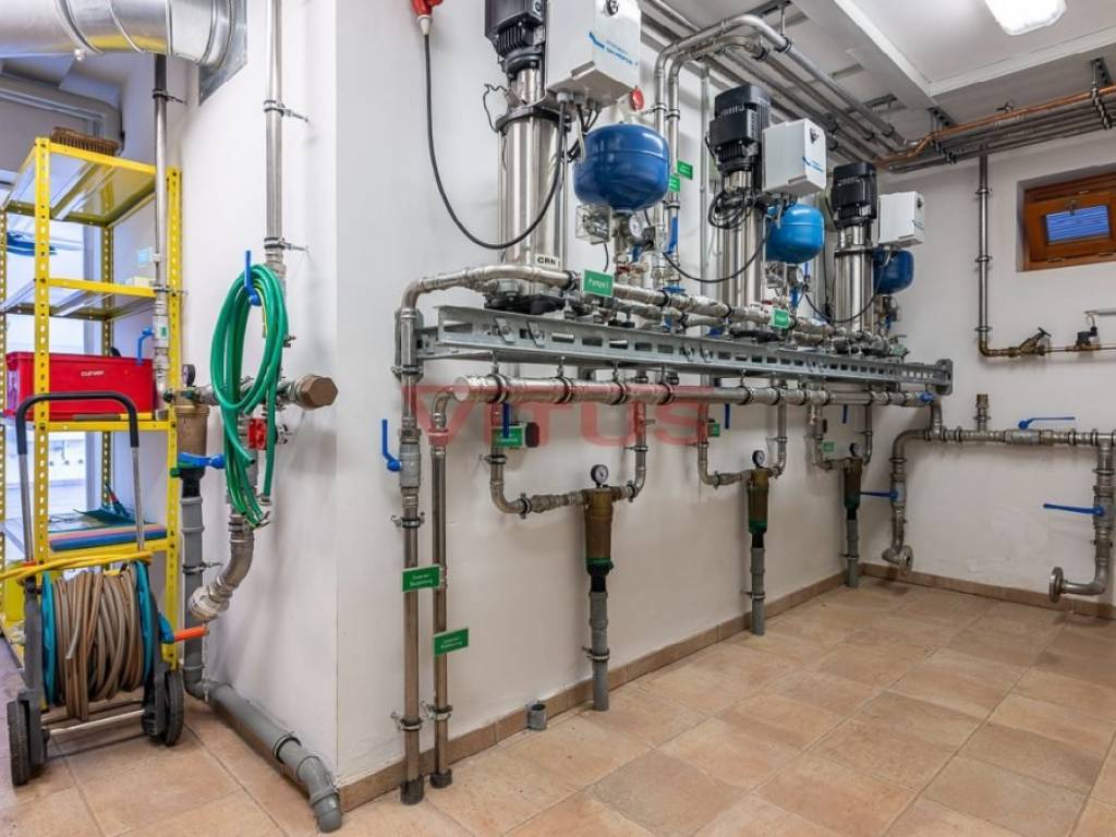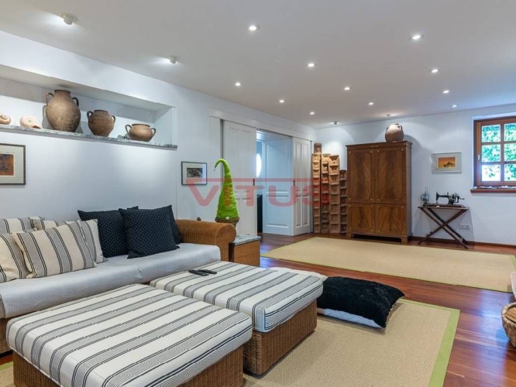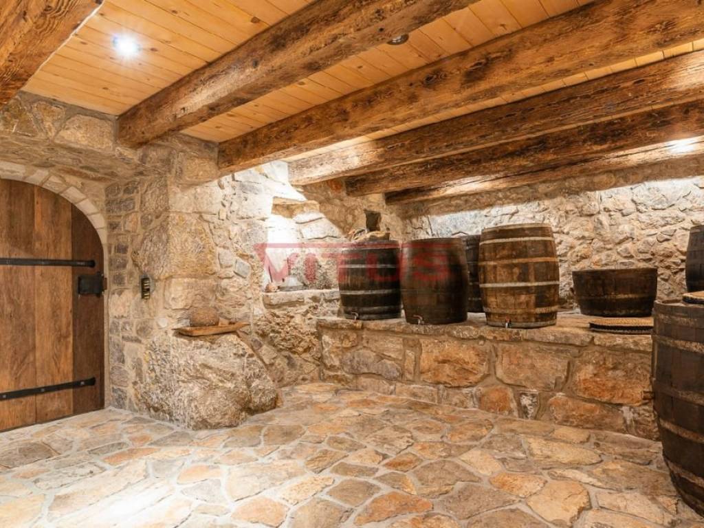 U suterenu je smještena konoba s kamenim zidovima i starim bačvama za vino. U nastavku se nalaze kupaonica, spremište, garaža i pomoćne prostorije kotlovnice s najmodernijom tehnologijom.
