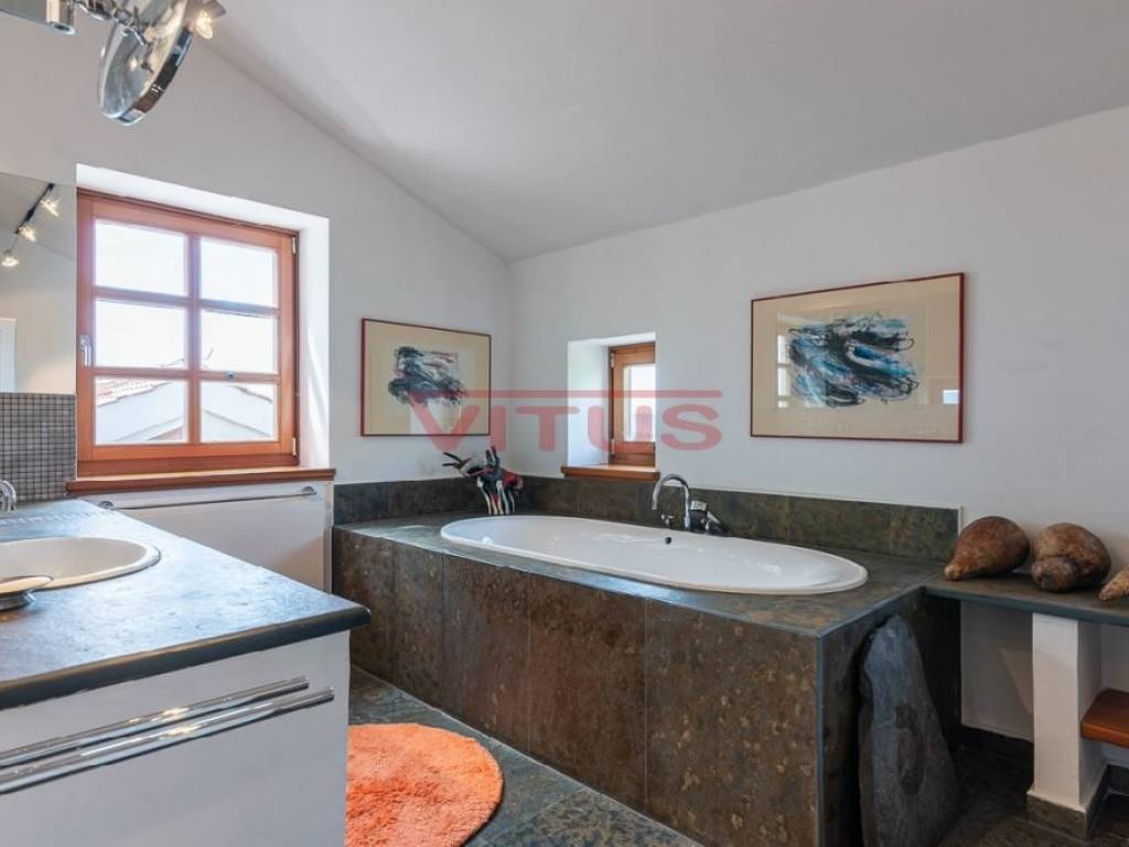Na prvom katu smještene su spavaća soba, garderoba te dvije kupaonice. S krovne terase pruža se panoramski pogled na more.