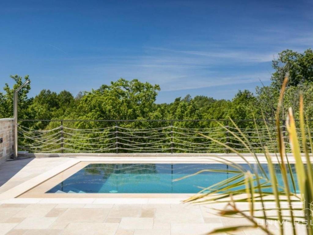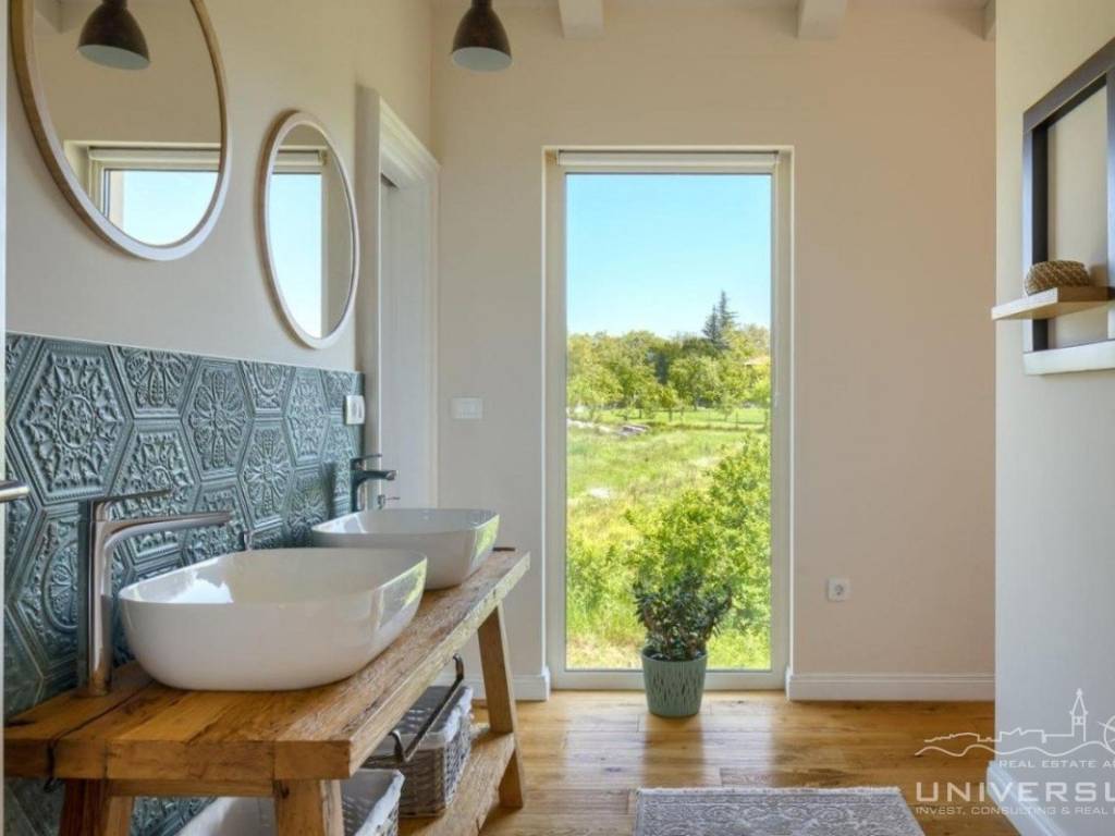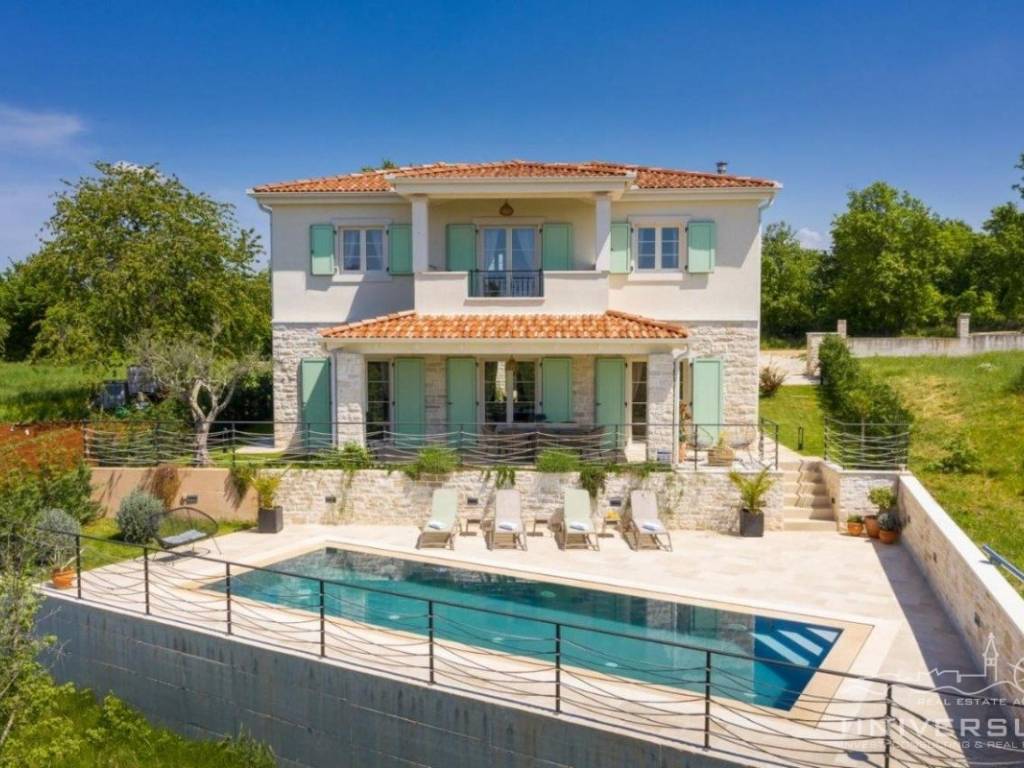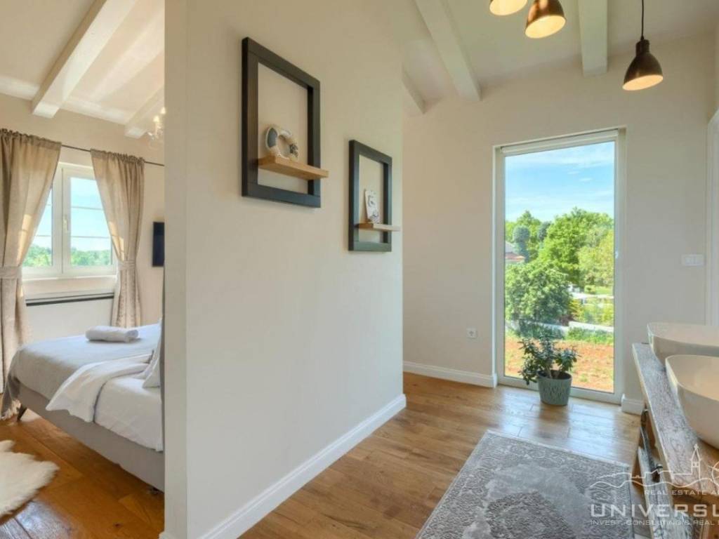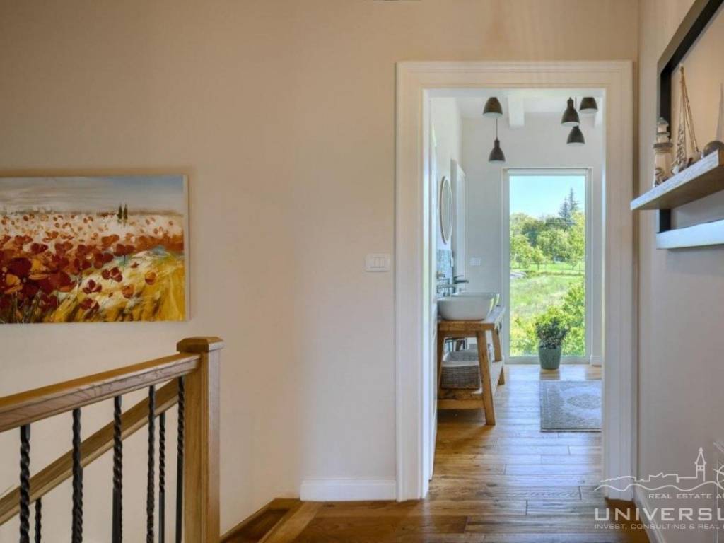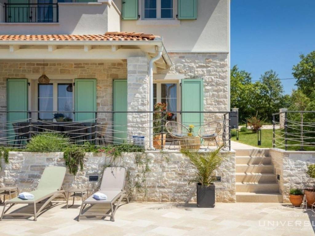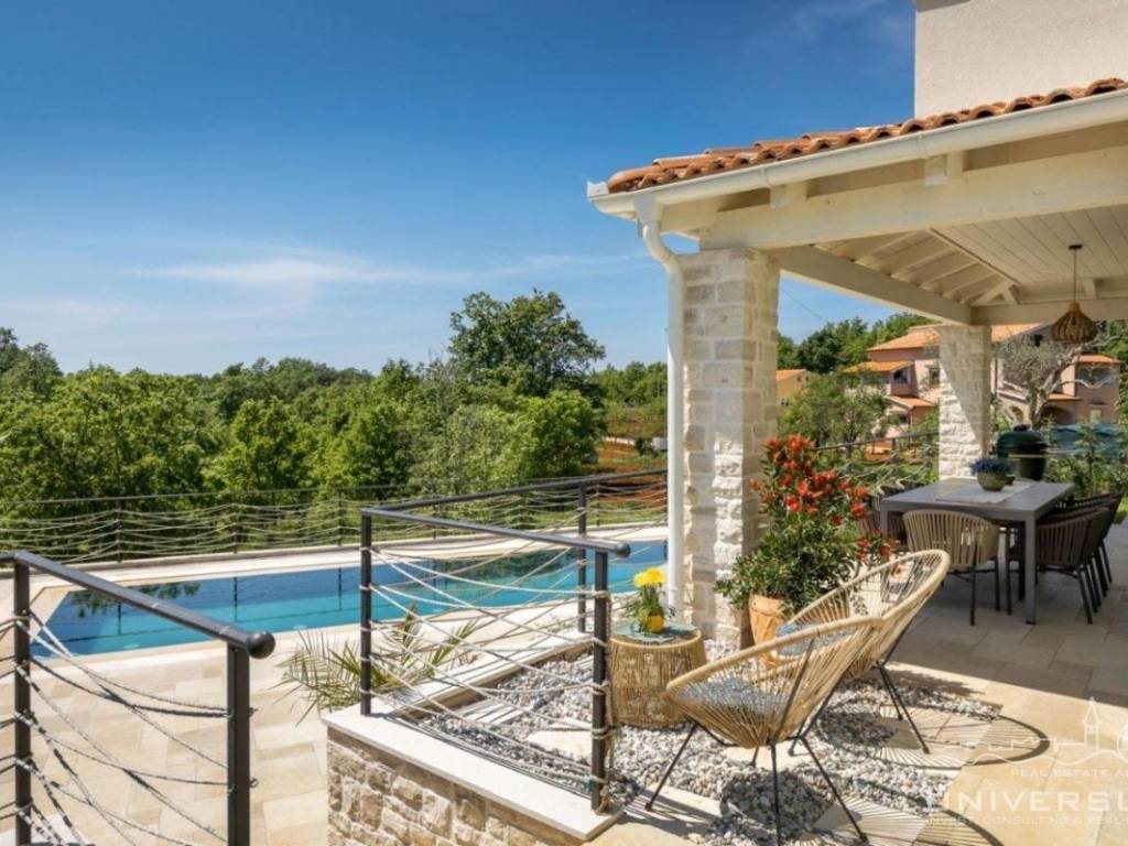 Doživite očaravajuću ljepotu ove prostrane vile u istarskom stilu, zajedno sa slikovitim pogledom, zadivljujućim bazenom i privatnim balkonom u glavnoj spavaćoj sobi. Čim uđete, očarat će vas prostrani i dobro osvijetljeni dnevni boravak koji odiše elegancijom i stilom. Veliki prozori preplavljuju područje prirodnim svjetlom, dok ugodan kamin dodaje toplinu okolini. Kuhinja je utočište za kuhare, opremljena vrhunskim aparatima i otokom koji kuhanje čini lakim. U prizemlju se nalazi spavaća soba sa vlastitom kupaonicom i direktnim izlazom na dvorište. Izađite iz dnevnog boravka u predivan bazen i prostor za sunčanje.