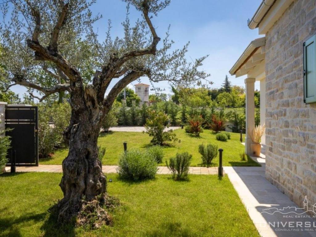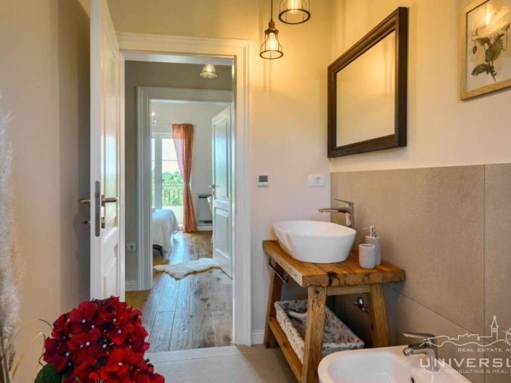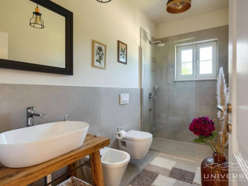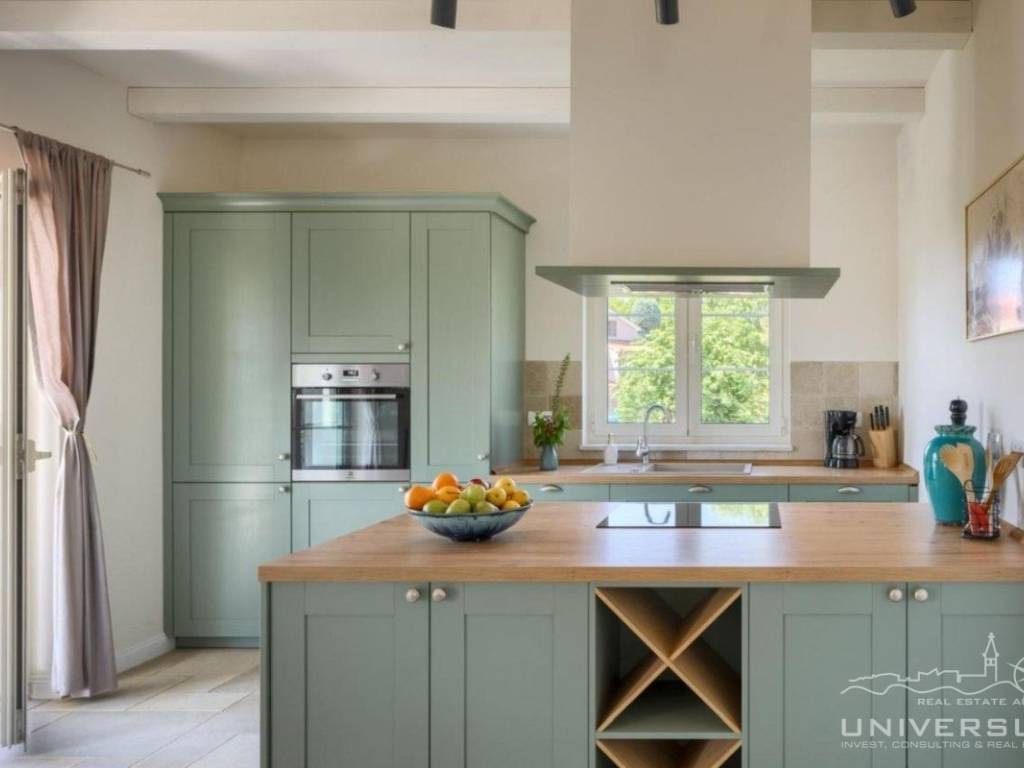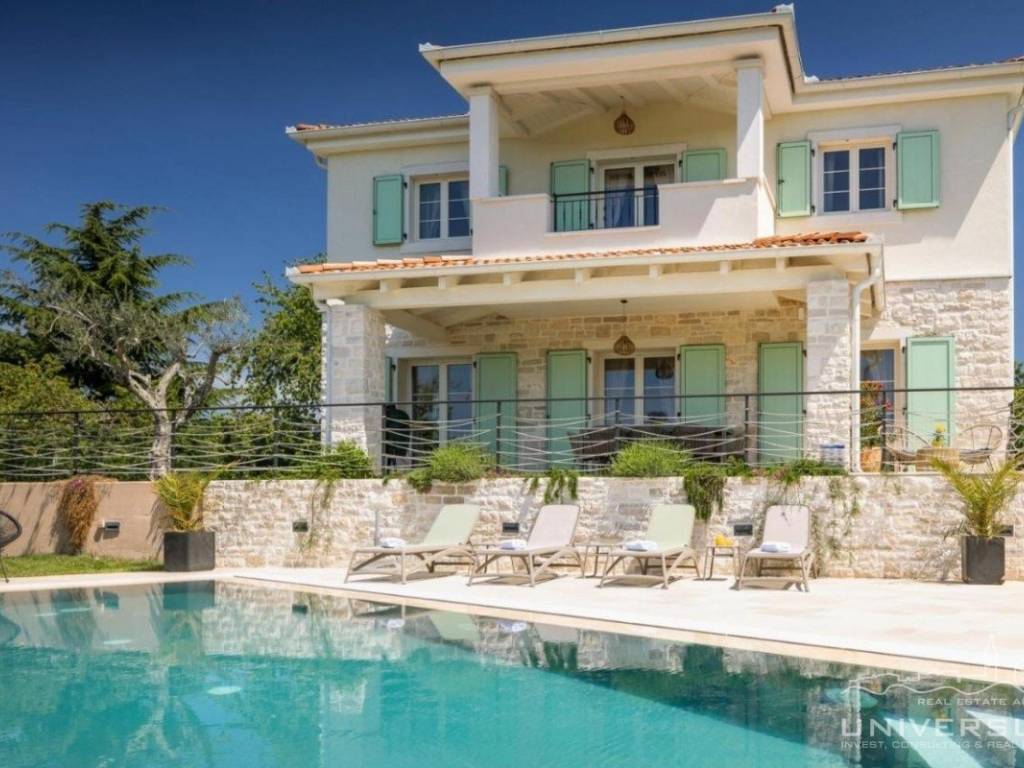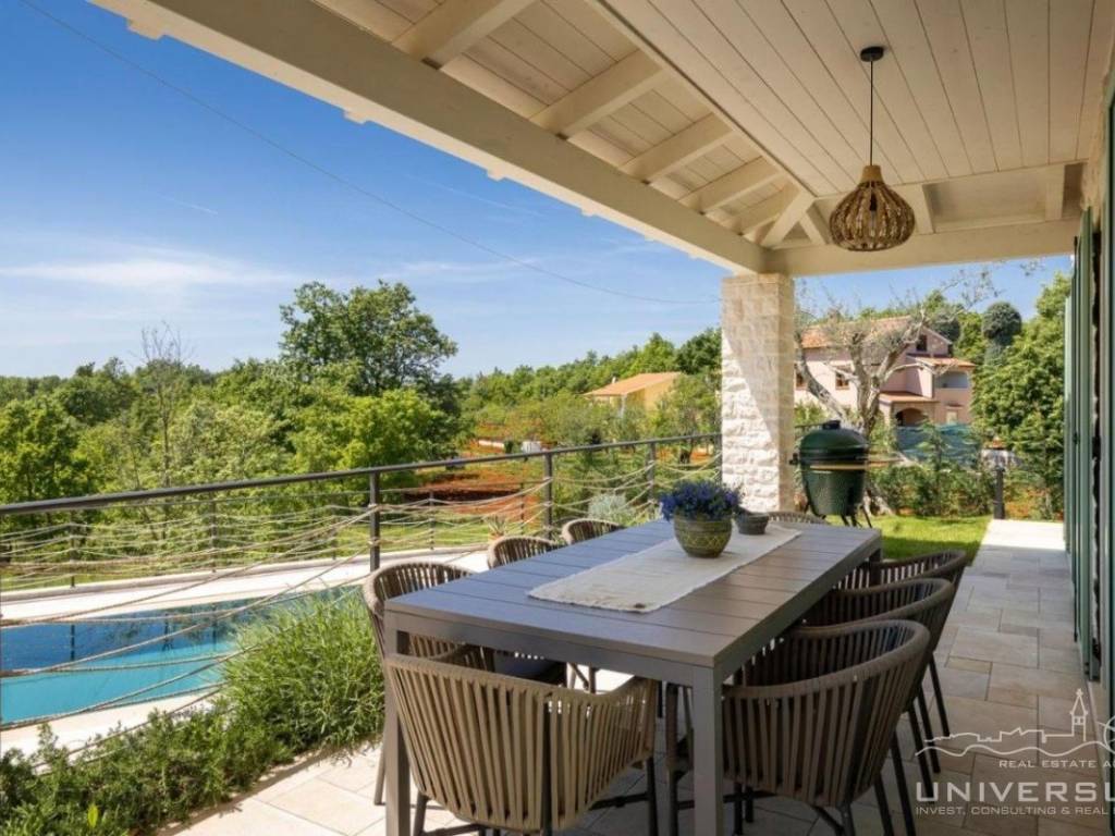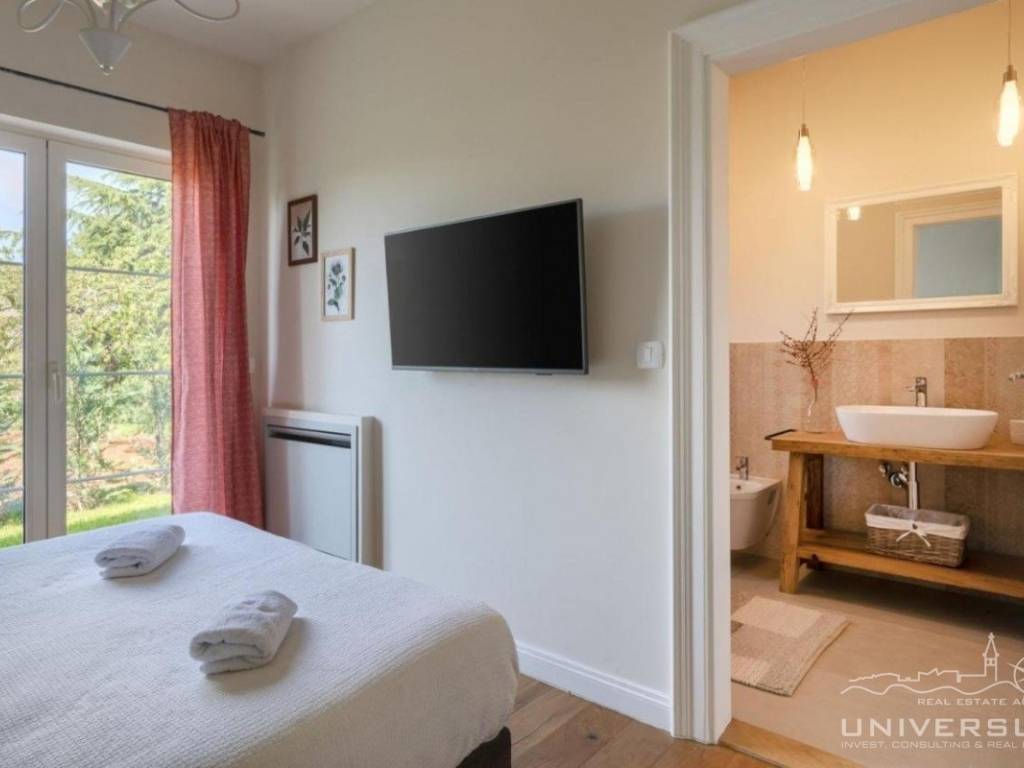 Doživite očaravajuću ljepotu ove prostrane vile u istarskom stilu, zajedno sa slikovitim pogledom, zadivljujućim bazenom i privatnim balkonom u glavnoj spavaćoj sobi. Čim uđete, očarat će vas prostrani i dobro osvijetljeni dnevni boravak koji odiše elegancijom i stilom. Veliki prozori preplavljuju područje prirodnim svjetlom, dok ugodan kamin dodaje toplinu okolini. Kuhinja je utočište za kuhare, opremljena vrhunskim aparatima i otokom koji kuhanje čini lakim. U prizemlju se nalazi spavaća soba sa vlastitom kupaonicom i direktnim izlazom na dvorište. Izađite iz dnevnog boravka u predivan bazen i prostor za sunčanje.