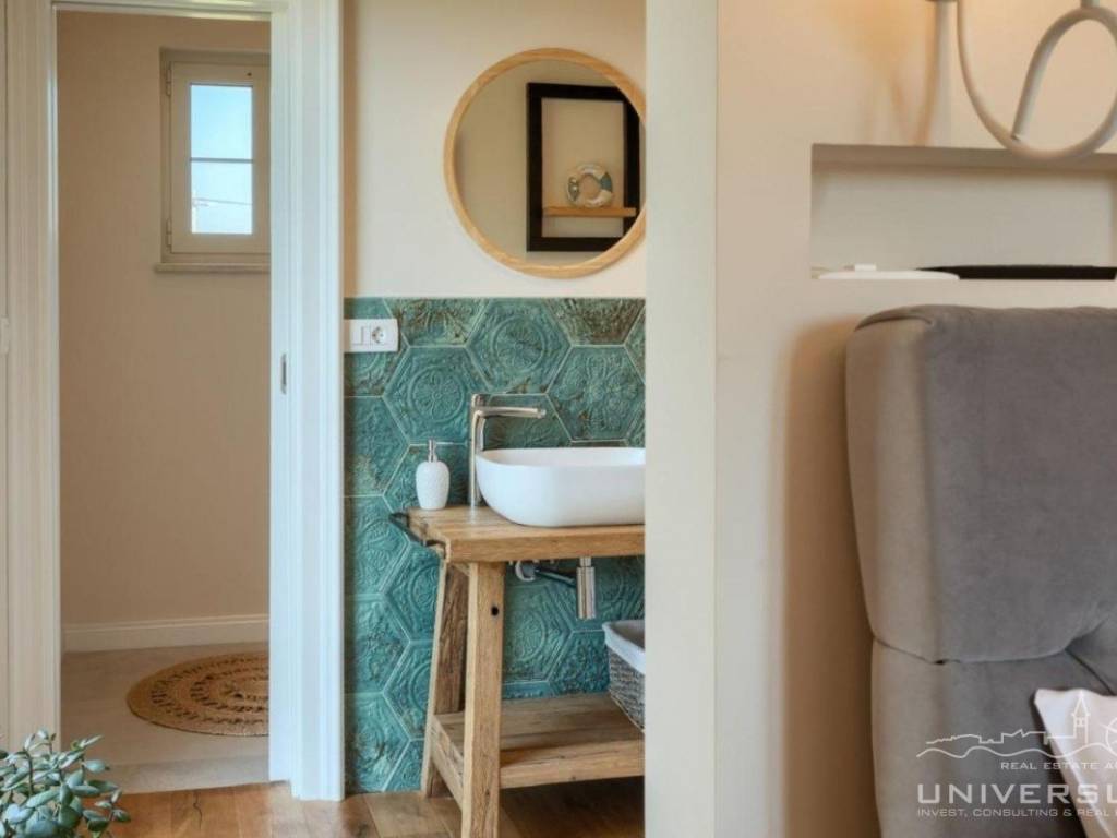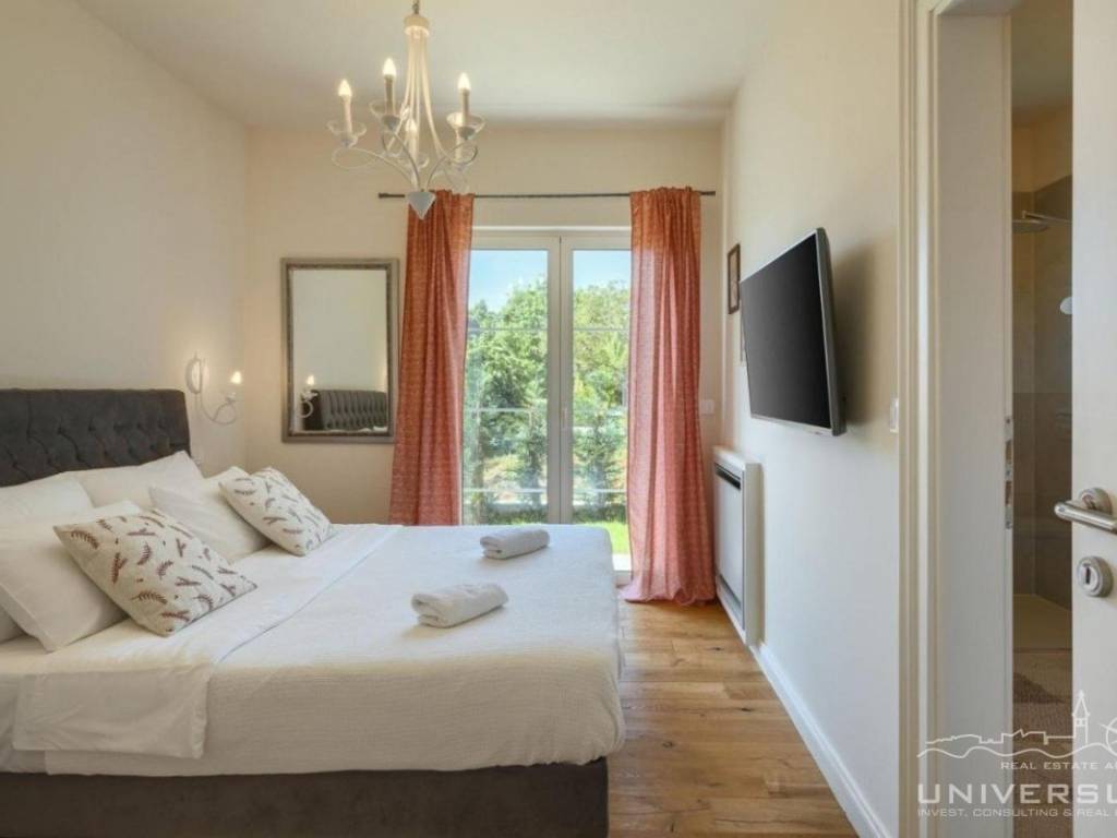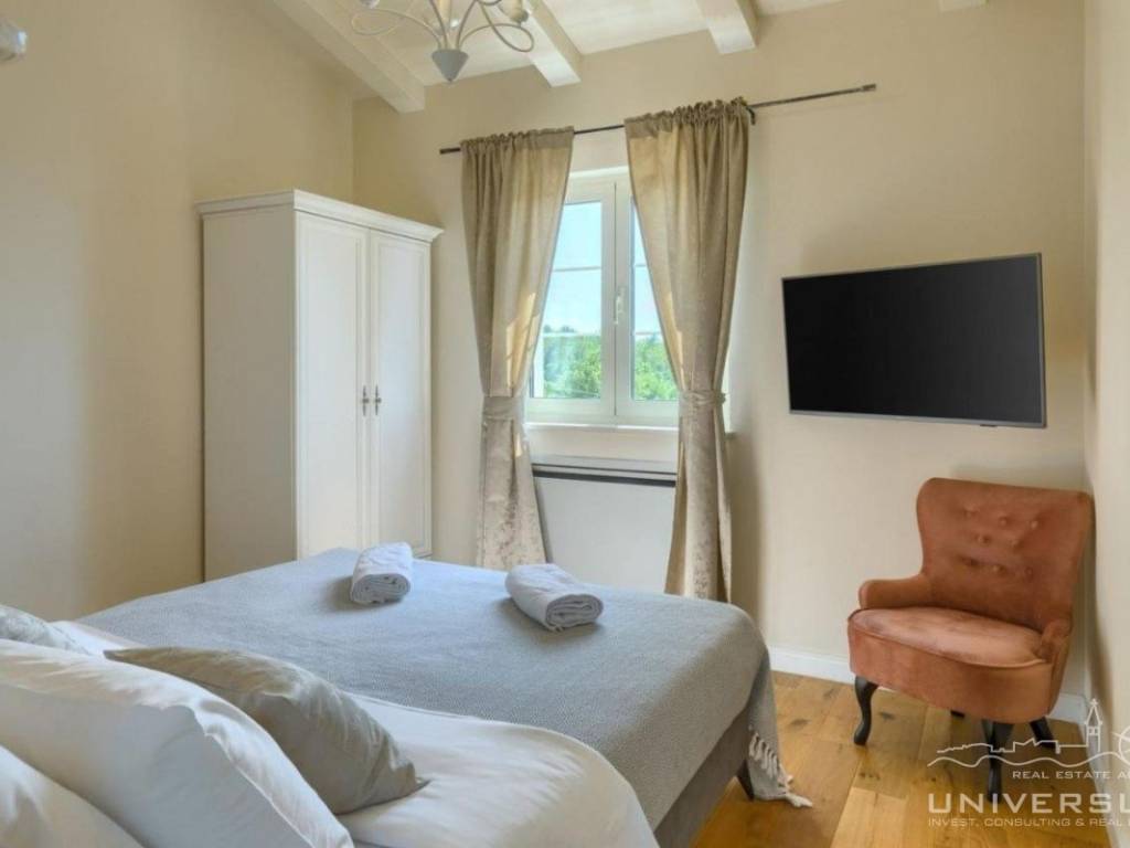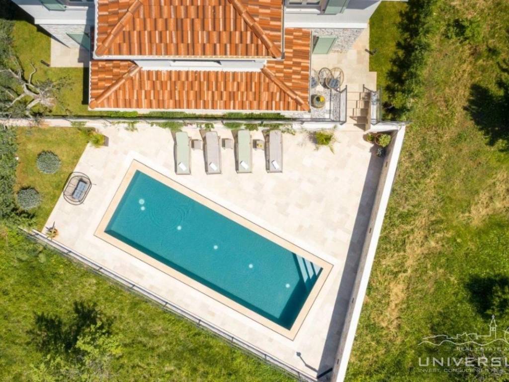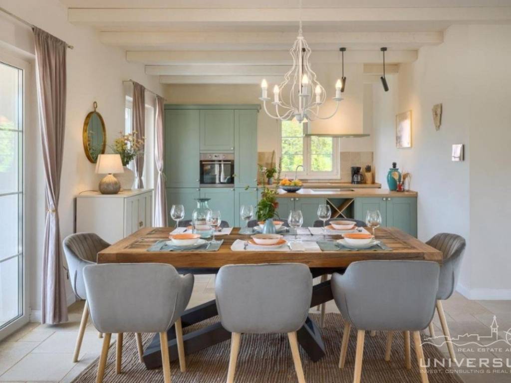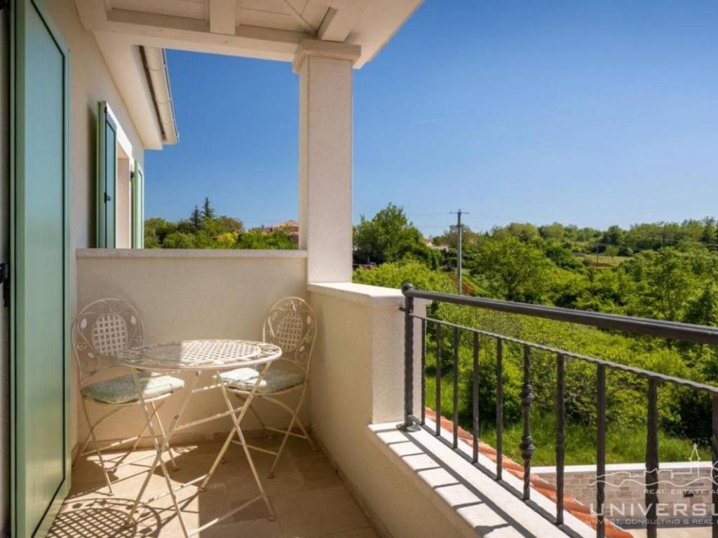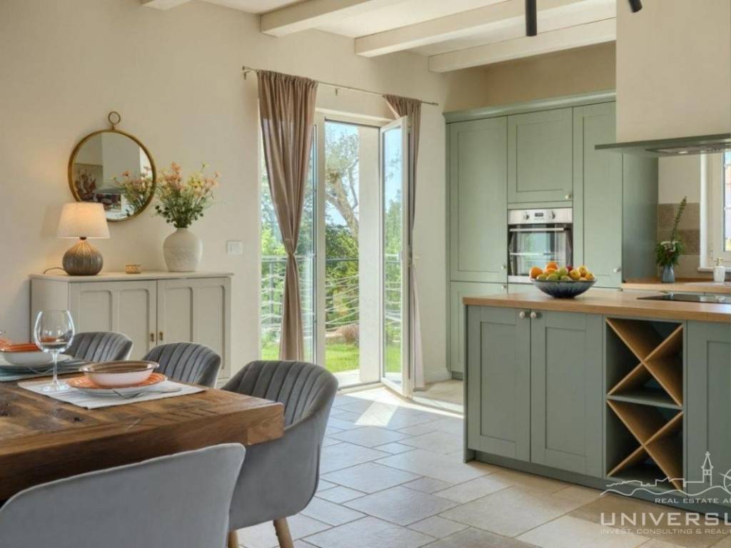Doživite očaravajuću ljepotu ove prostrane vile u istarskom stilu, zajedno sa slikovitim pogledom, zadivljujućim bazenom i privatnim balkonom u glavnoj spavaćoj sobi. Čim uđete, očarat će vas prostrani i dobro osvijetljeni dnevni boravak koji odiše elegancijom i stilom. Veliki prozori preplavljuju područje prirodnim svjetlom, dok ugodan kamin dodaje toplinu okolini. Kuhinja je utočište za kuhare, opremljena vrhunskim aparatima i otokom koji kuhanje čini lakim. U prizemlju se nalazi spavaća soba sa vlastitom kupaonicom i direktnim izlazom na dvorište. Izađite iz dnevnog boravka u predivan bazen i prostor za sunčanje.