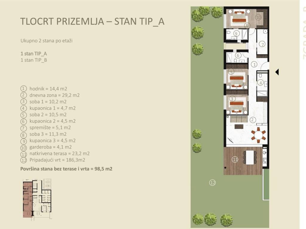 Otkrijte ovaj lijepo dizajniran stan u prizemlju koji se nalazi u elegantnoj zgradi. S ukupnom površinom od 136.36 m2 i vrtom od 186 m2, zakoračite unutra i istražite prostranu tlocrtnu površinu od 98,50 m2. Stan se sastoji od ulaznog hodnika, tri spavaće sobe (jedna ima vlastitu kupaonicu), dvije odvojene kupaonice, ostave, kuhinje i dnevnog boravka s izlazom na natkrivenu terasu površine 23,20m2. Terasa se otvara prema prekrasnom vrtu opremljenom automatskim sustavom za navodnjavanje i dobro održavanim okolišem.