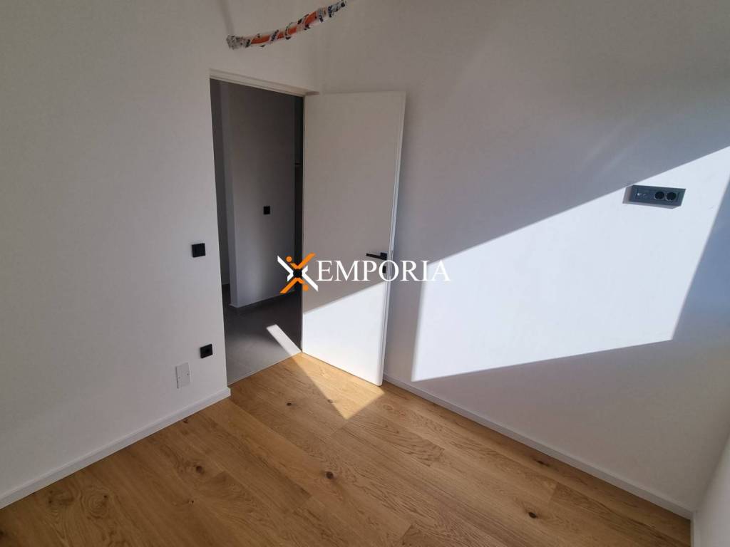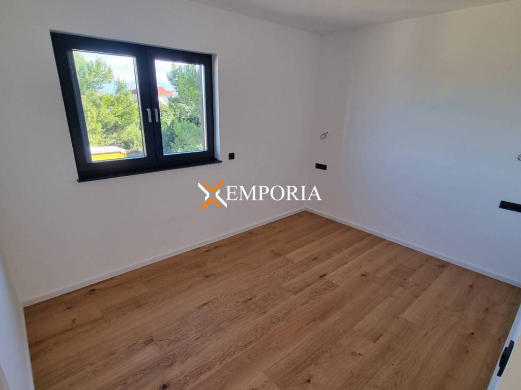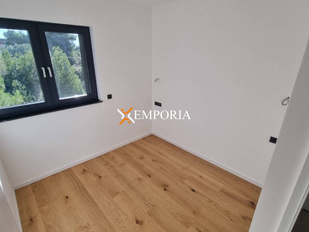 Gradnja ciglenim termo blokom. Termoizolacija fasade 10 cm stiropor. Podne obloge su pločice i parketi. Aluminijski prozori s troslojnim staklom, komarnicima te električnim roletama i žaluzinama. Klima uređaji su u dnevnom boravku i svakoj spavaćoj sobi. Osim toga, podno grijanje na struju u kupaonici. Nadalje, ulazna vrata su protuprovalna i protupožarna. Ovom apartmanu pripada vanjski tuš u dvorištu zgrade.