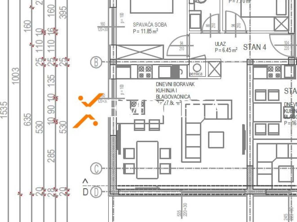 Ovo je stan na prvom katu. Raspored prostorija čine hodnik, 2 spavaće sobe, kupaonica, kuhinja s blagovaonicom i dnevnim boravkom te natkrivena terasa. Neto korisna površina opisanih prostorija s terasom iznosi 67,75 m2. Dodatno apartmanu pripadaju dva parkirališna mjesta.