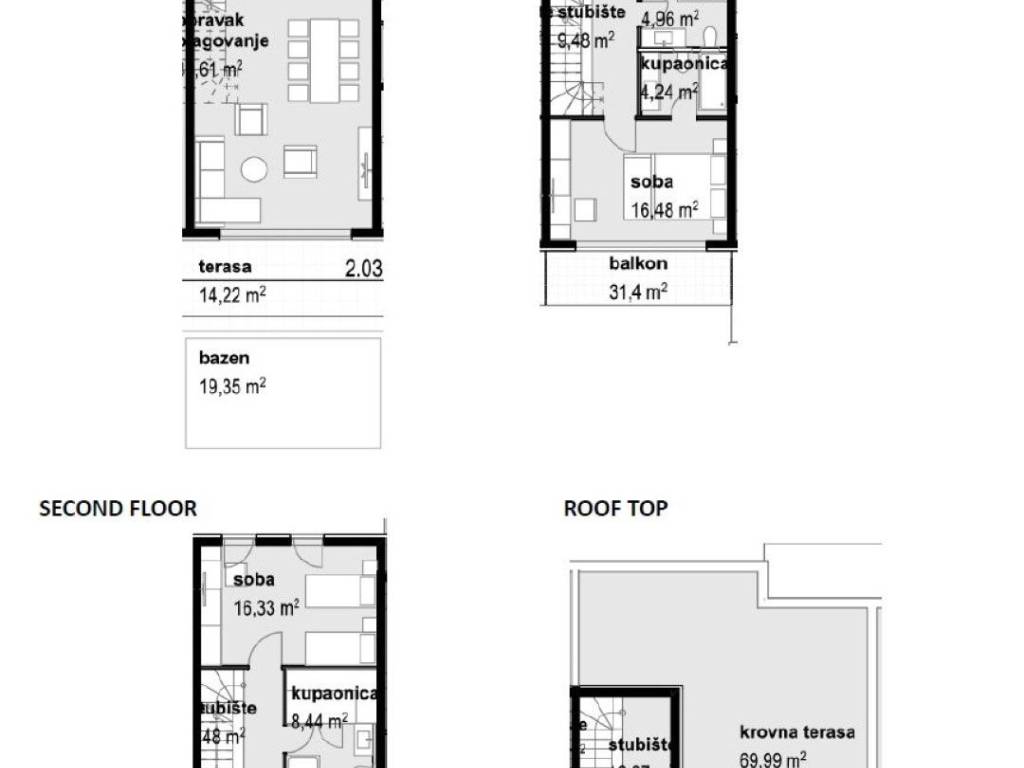 Nadalje, unutarnje stepenice vode na krovnu terasu površine 69,99 m2