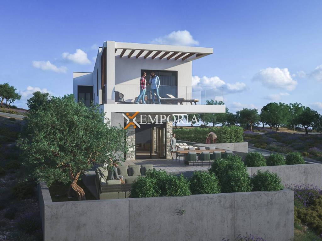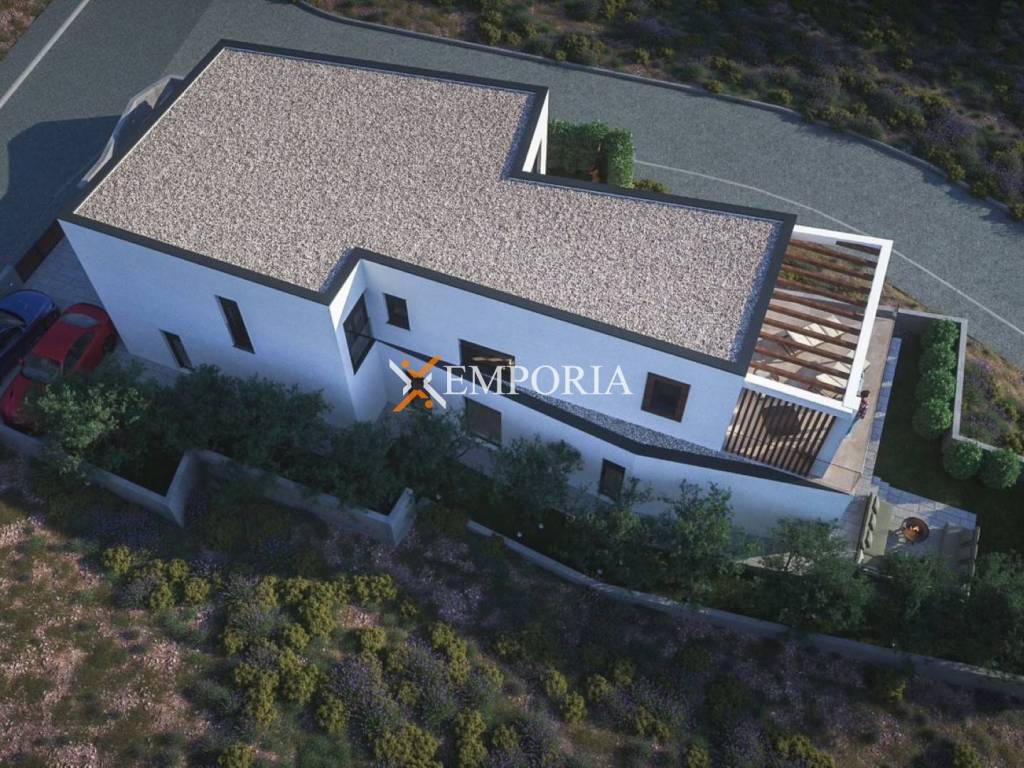 Kuća se sastoji od prizemlja i kata. Raspored prostorija u prizemlju čine garaža, strojarnica, wellness, hodnik, kuhinja s blagovaonicom i dnevnim boravkom. Unutarnje stepenice vode na prvi kat, gdje se nalaze hodnik, spremište, četiri spavaće sobe, svaka s vlastitom kupaonicom i garderobom. Glavna spavaća soba ima izlaz na prostranu, pergolom natkrivenu terasu površine 22 m2.
