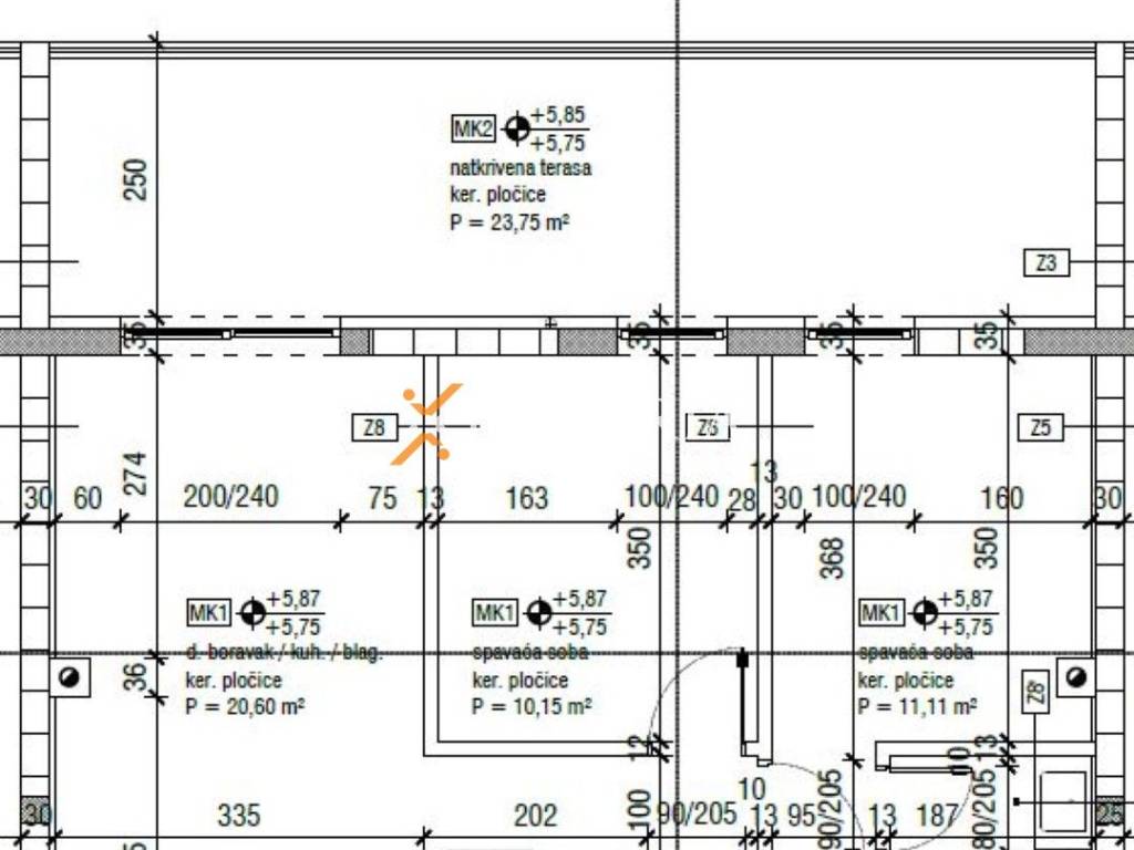 Raspored prostorija sastoji se od hodnika, spavaće sobe, spavaće sobe s kupaonicom, kupaonice, kuhinje s blagovaonicom i dnevnim boravkom te natkrivene terase. Osim toga, stan ima i krovnu terasu od 80,98 m2. Neto korisna površina opisanih prostorija je 87,01 m2.